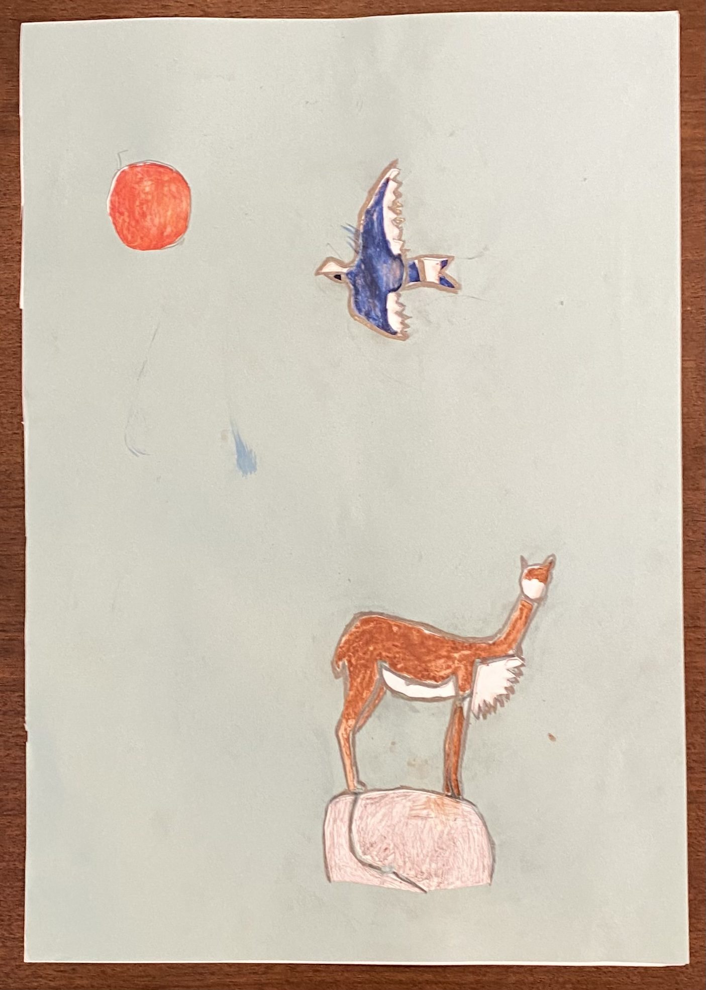 空に浮かぶ太陽と、大きく羽を広げた鳥の対比がとても堂々としていて、すごく魅力的な作品ですね😊