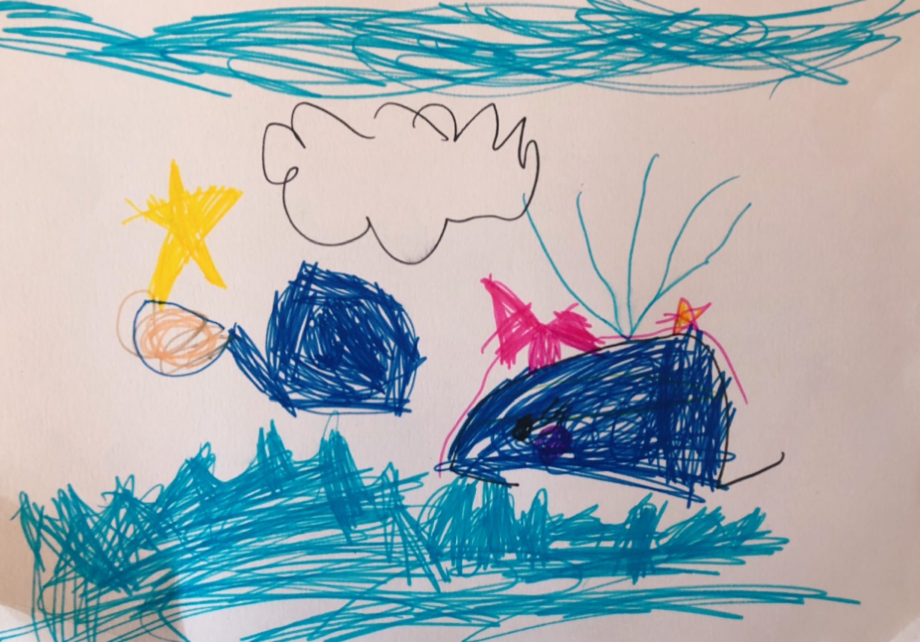 海の波を描こうとペンの向きを変えてぬりぬりぬったんだね。くじらさんとお空や海のあおいろをかえてぬってたり、塗り方をかえてみたり、くふうがつまっててすてきですー!