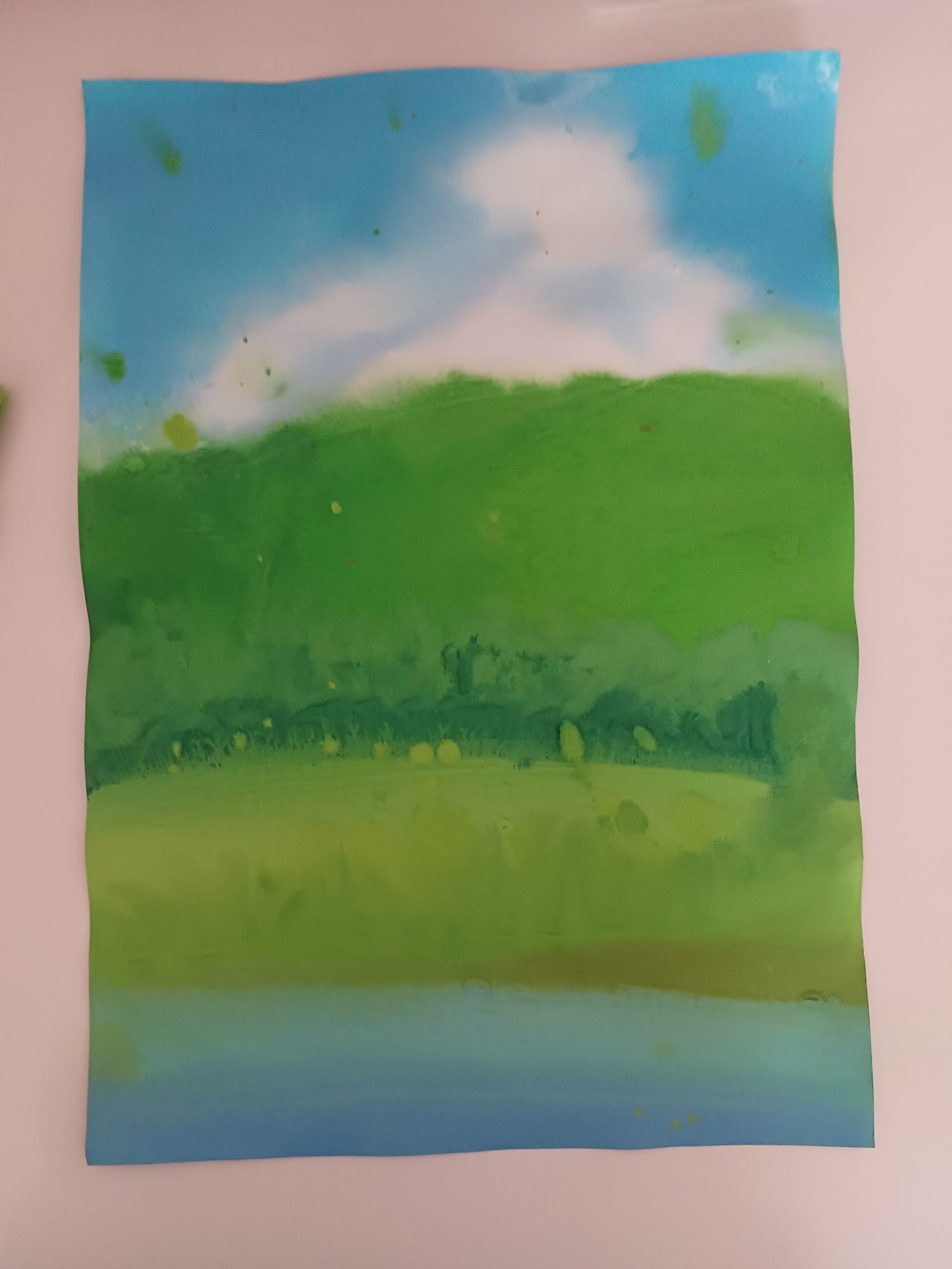 たとえば中間にある深緑の森の際がその手前の黄緑の草原と滲んだことにより、森の方に黄緑色の樹木ができていますね。