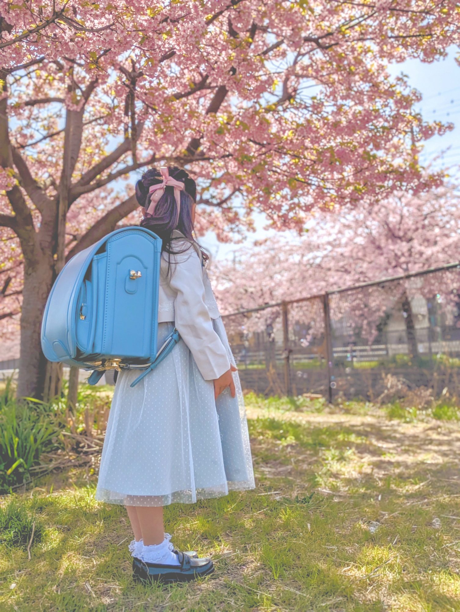 2枚目は、ランドセルの水色と桜のピンク色がマッチしていて素敵だなと思いました。