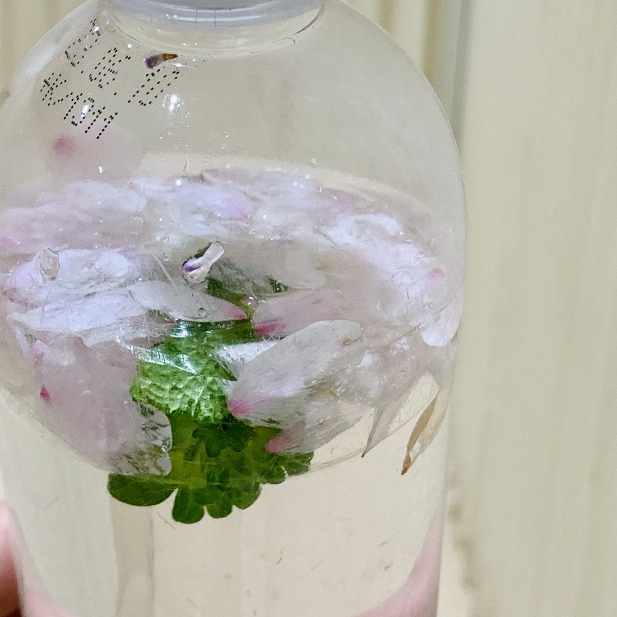 ペットボトルに桜の花びらが入ってます。 やさしい桜色で振るとキラキラとして素敵です。