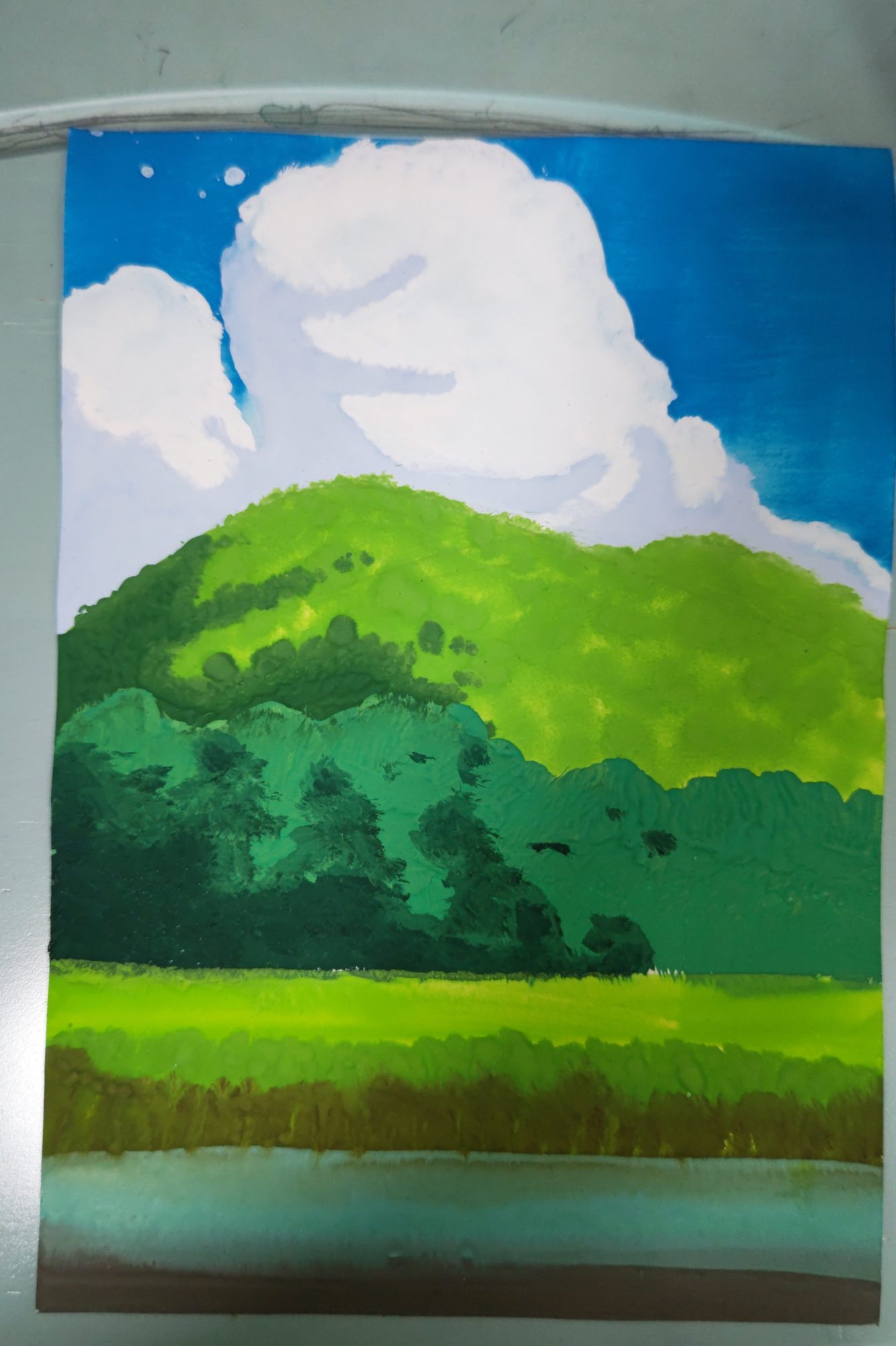 湖?池?かな。水面のじんわりした感じもよく出ていますし、雲や森の影の落ち方もすてきです👍