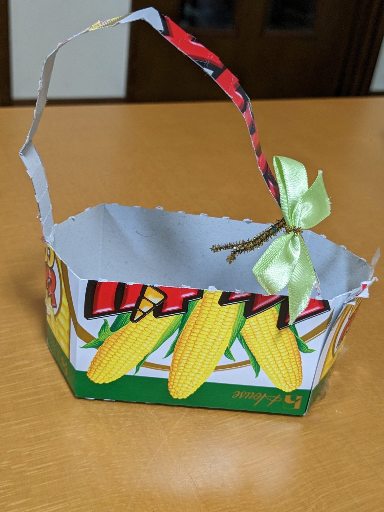 とんがりコーンの箱で何かできるかなと集中して、飾りつけしたり、紐をつけたり、がんばりました!