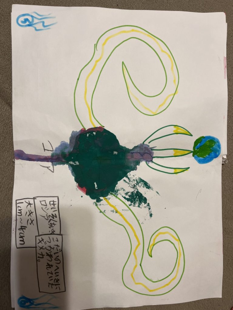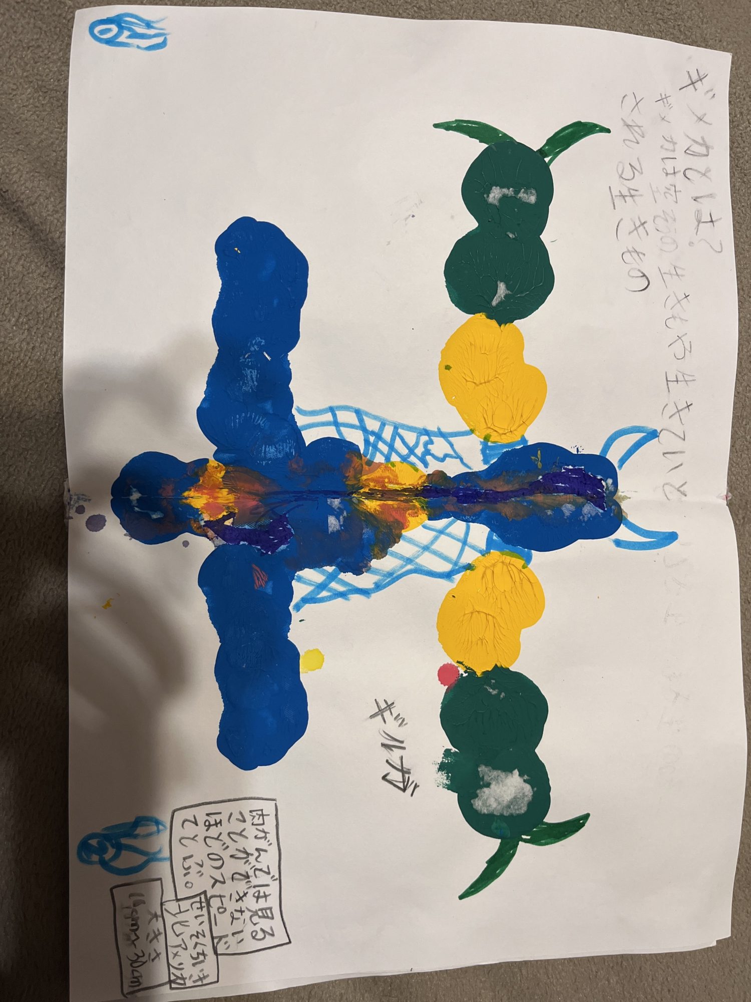 夕 せんせい 先生2023年4月27日 5:08 PM Haru331さん こんにちは。 ギメカ図鑑 とってもカッコいいね せいそくちやギメカのサイズもかいてあって、こまかいぶぶんまで しっかり考えてかいてあるから ほんものの図鑑みたい! デカルコマニーのおもしろい色や形を使って しんしゅのギメカがいっぱい。カラフルでみていてたのしいね ログインして返信する ↓