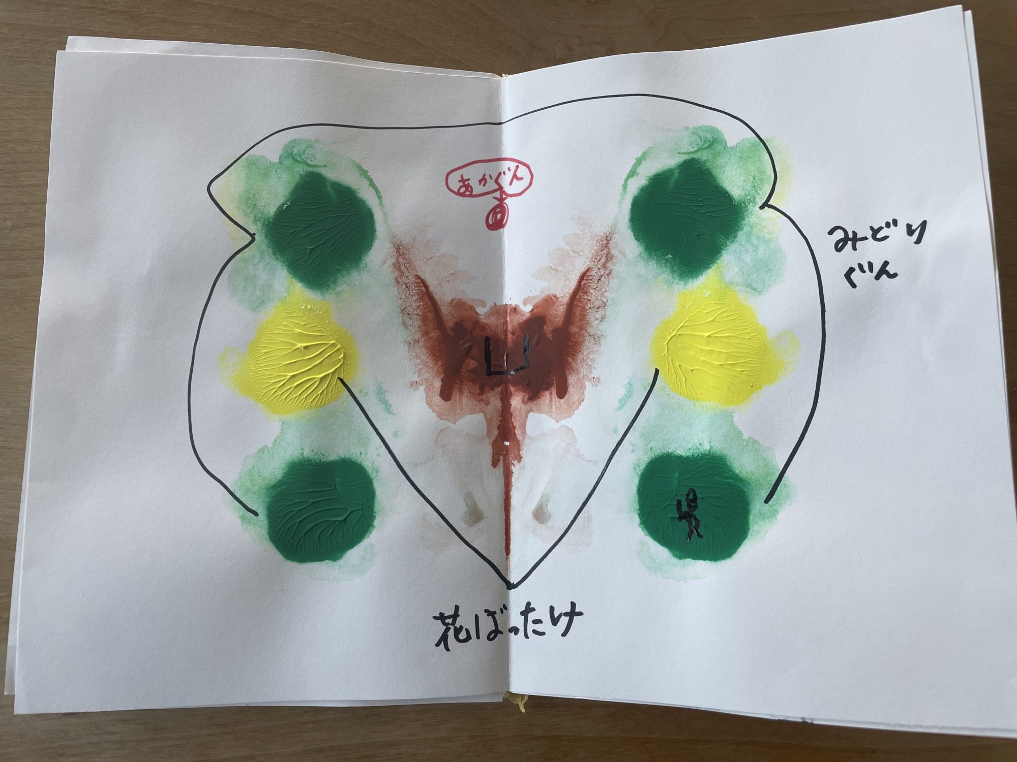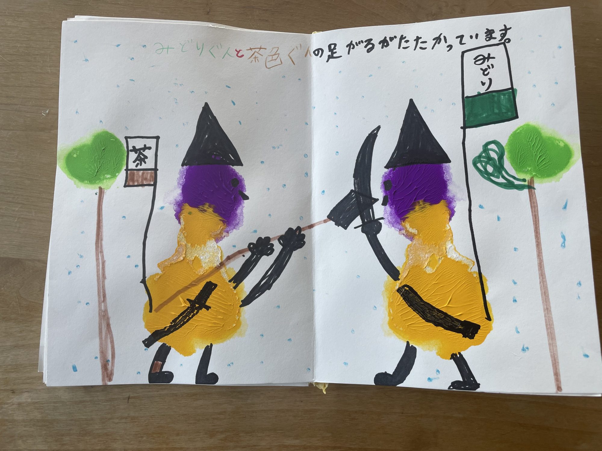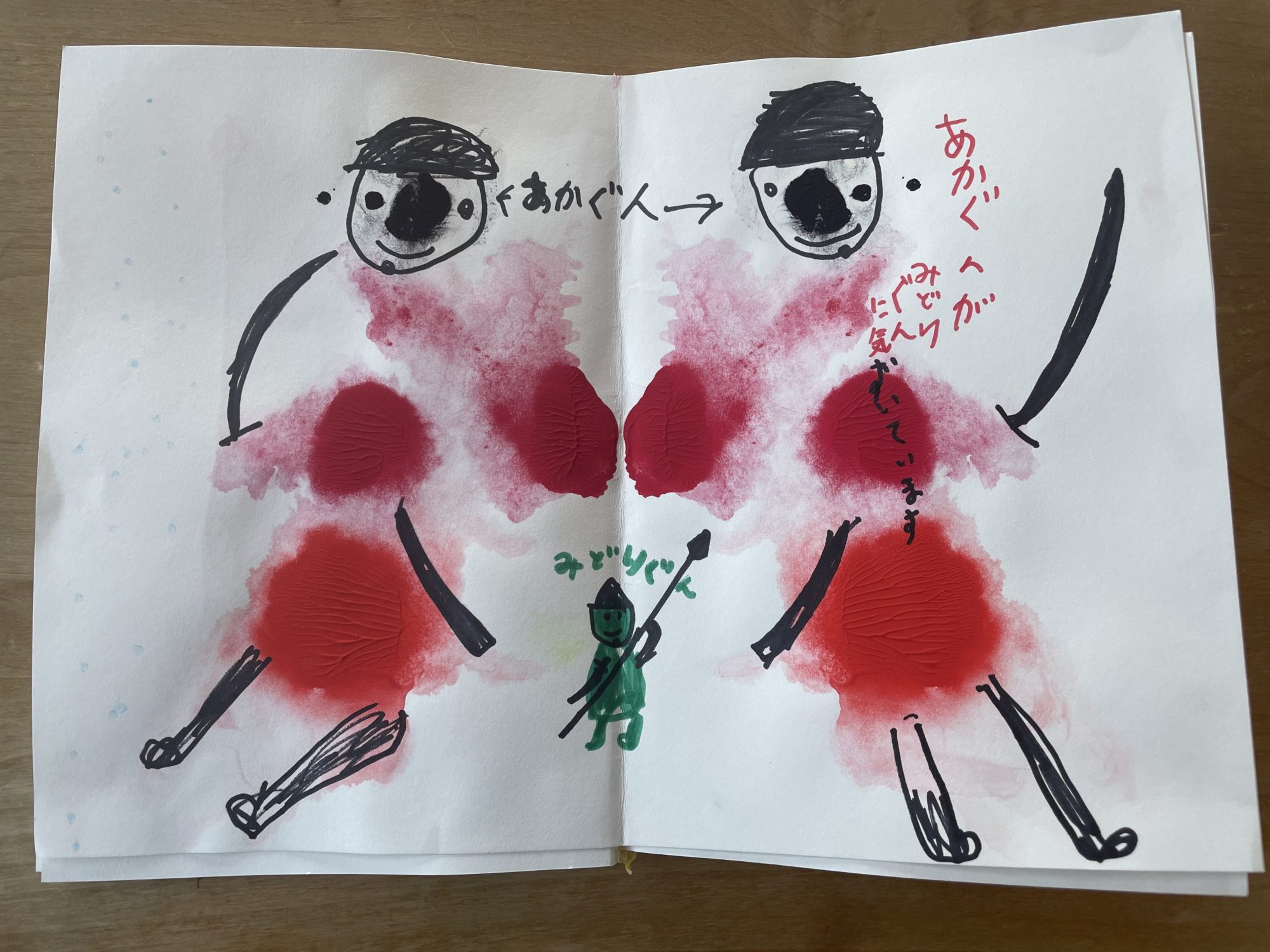 武士が大好きで、はじめのページの三色が、三軍の陣形に見えたようです。このように、できた色や形を陣形に見立てたり、一人ひとりの武士にしたりして楽しんでいました。