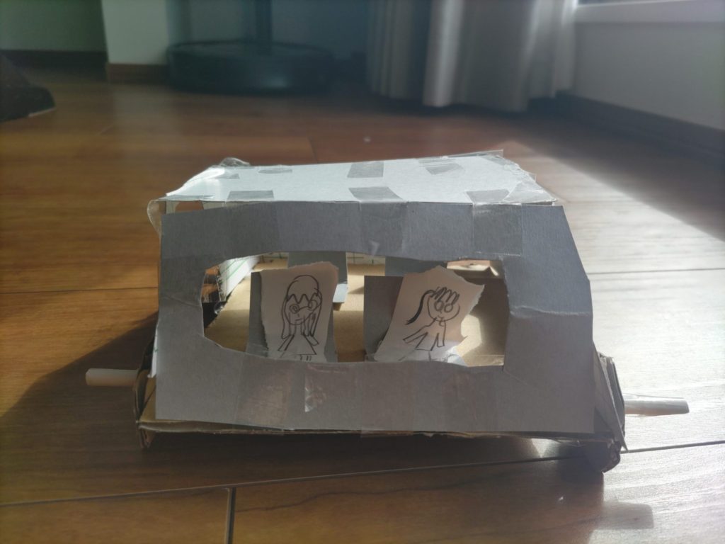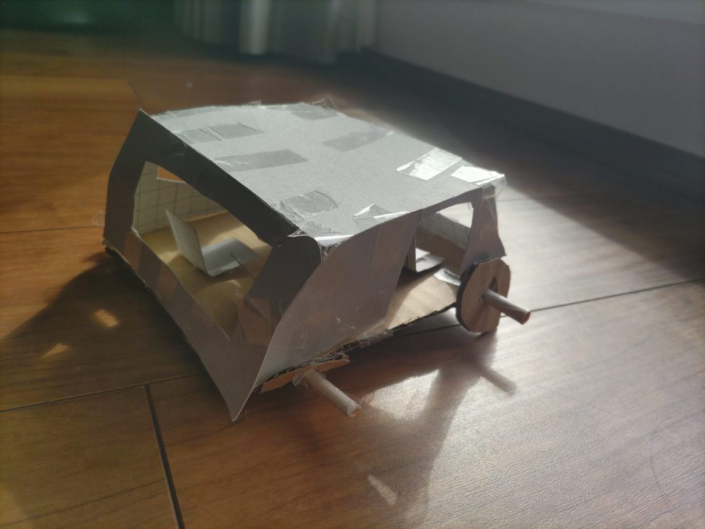 すごい立体的ですね! タイヤも回ったり、イスもあったり こういう工作が楽しいんだよね!