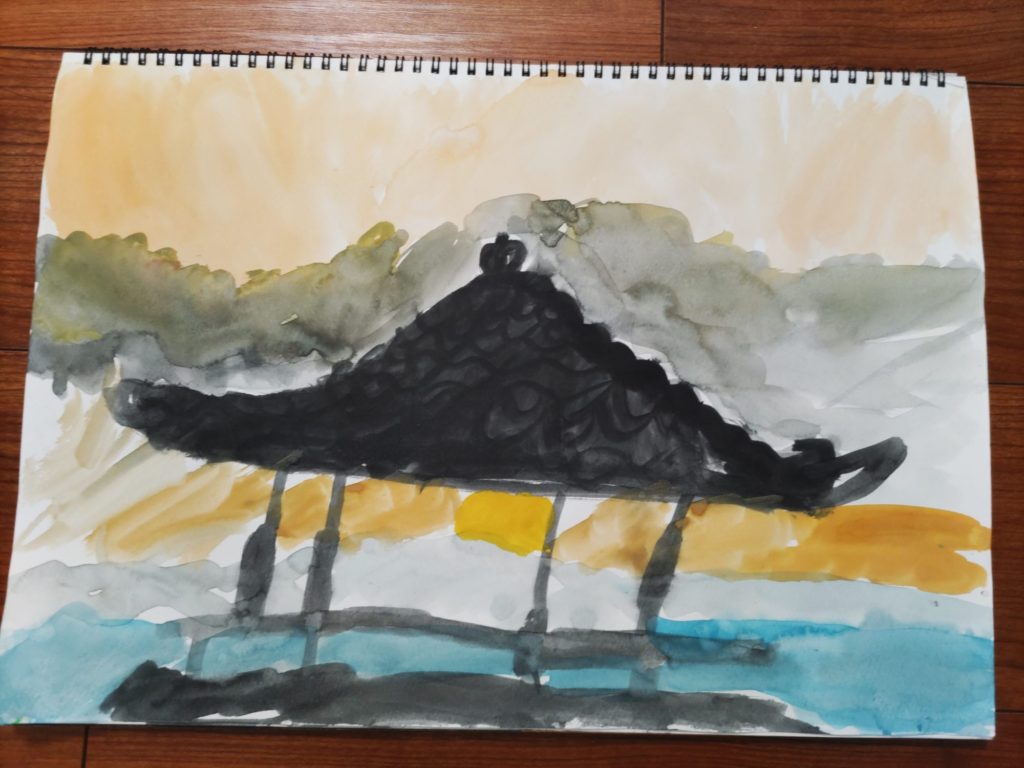 水彩えのぐのやさしい雰囲気と、夕焼けが、とても合っているね!すごく好きだ〜!