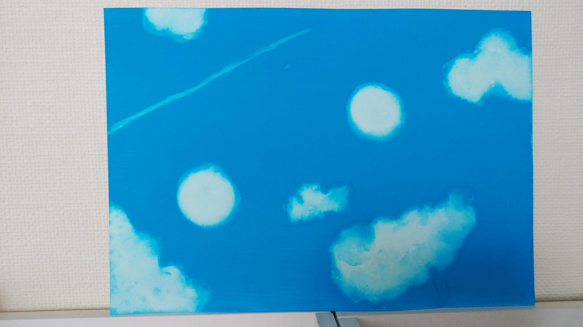 はじめての講座でとても楽しかった。講座の後に描いた空は青が均等にならなくて難しかった。コツを教えてください。(絵の具が足りなかったのかもしれません?)