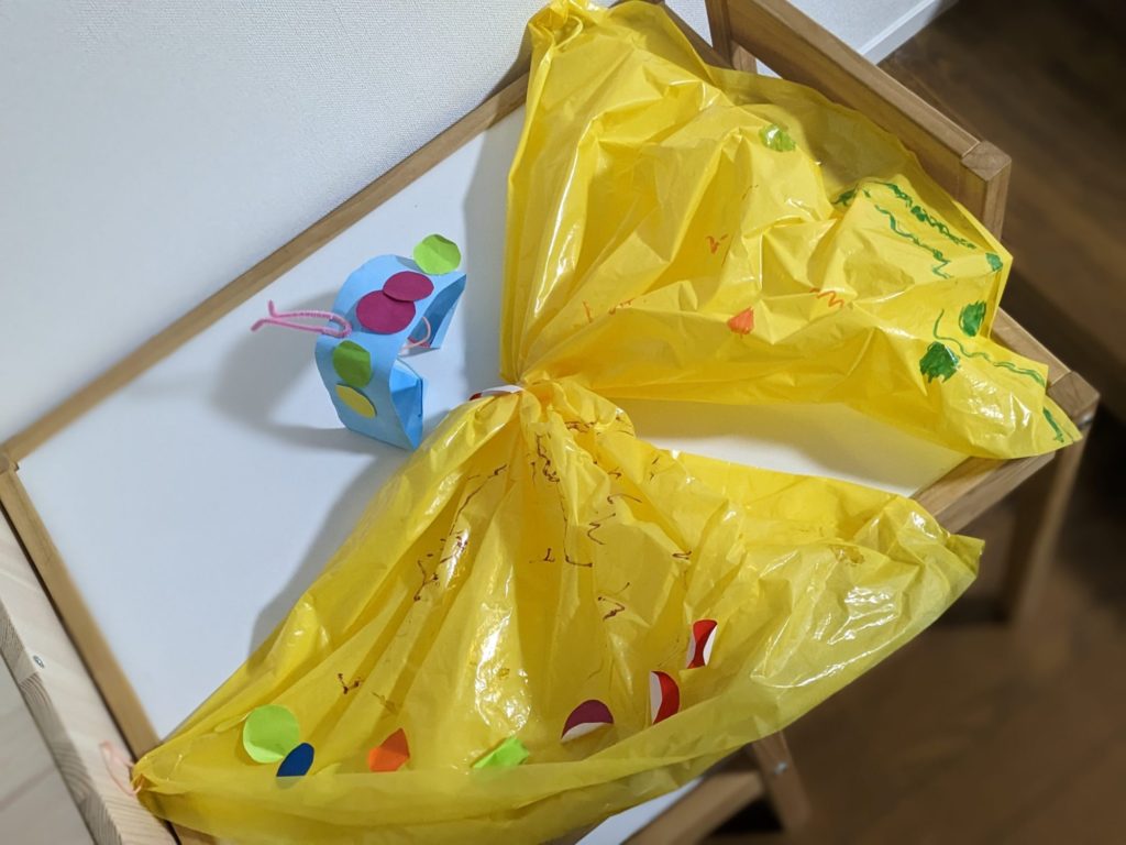 わあああこれまたとてもかわいらしいちょうちょさんですね🥰自身で作ったものでなりきりができるなんてとても楽しそうです!見た目も黄色にカラフルな水玉のような模様で公園のようなお花畑のような可愛らしくて楽しそうな印象をうけます✨
