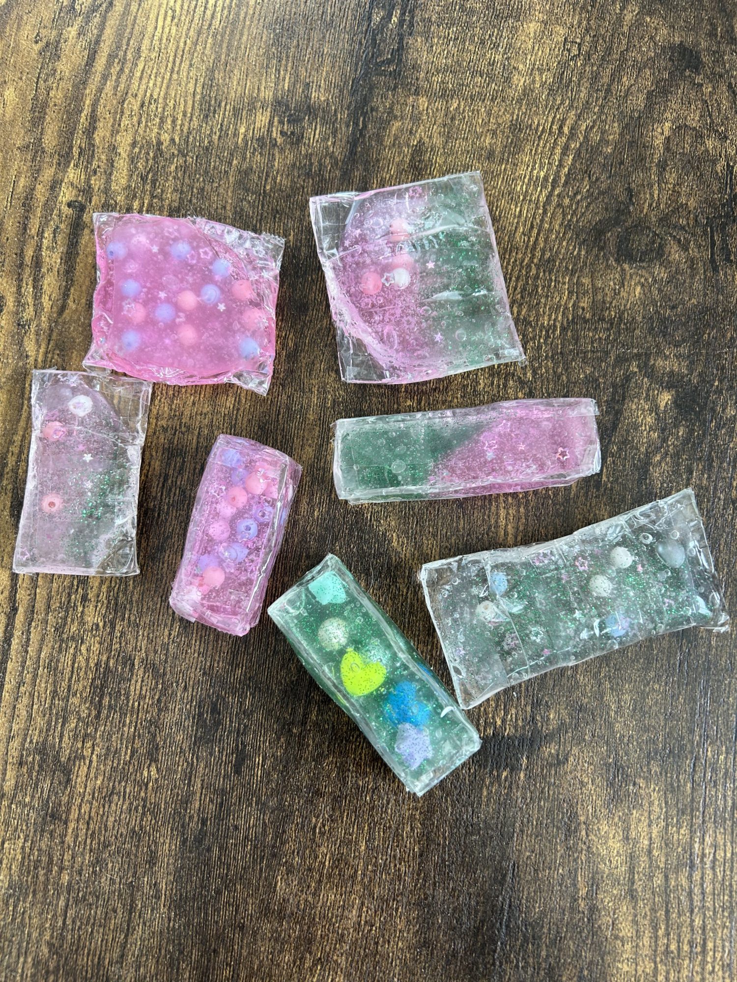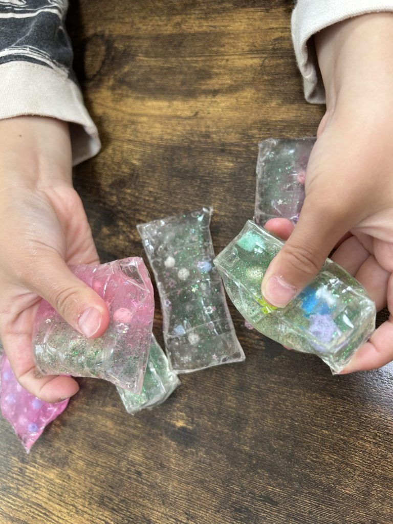 風邪でおやすみしていたのですが早々に回復したのでナノテープとスライムでスクイーズを作りました。