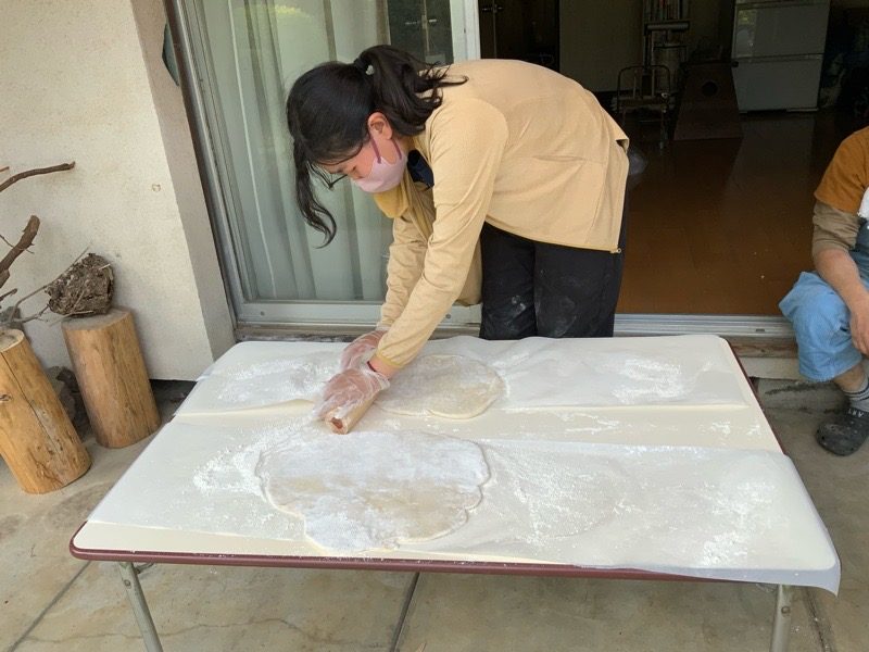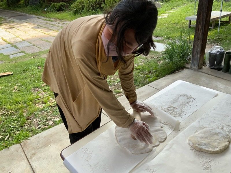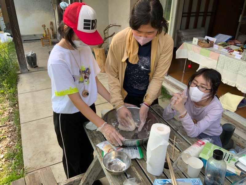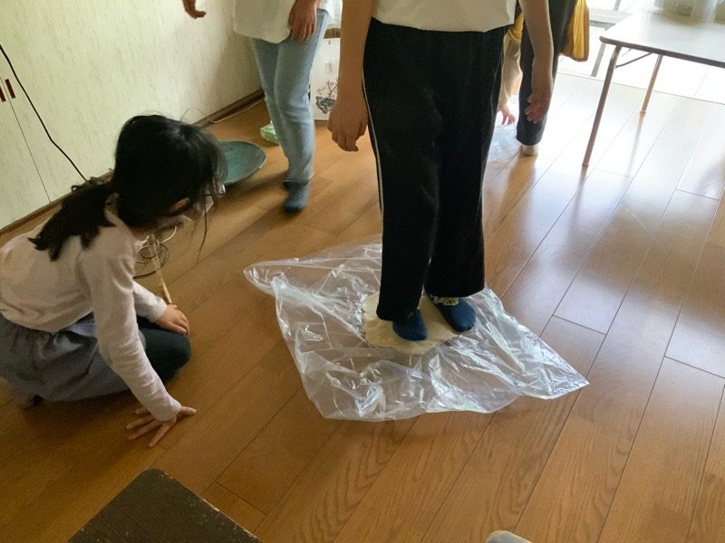 みんなでこねて寝かせて、足で踏んで、つくります。