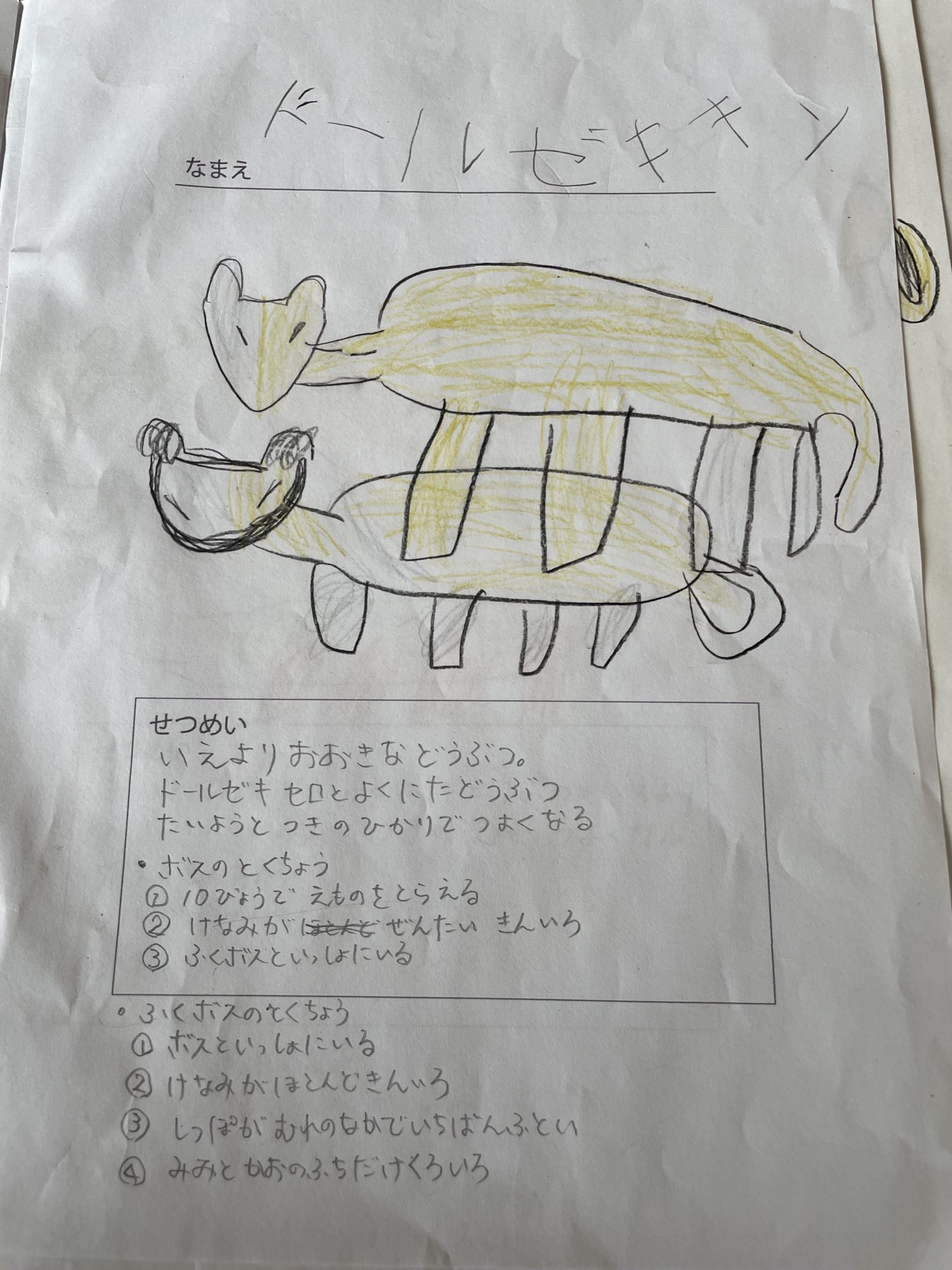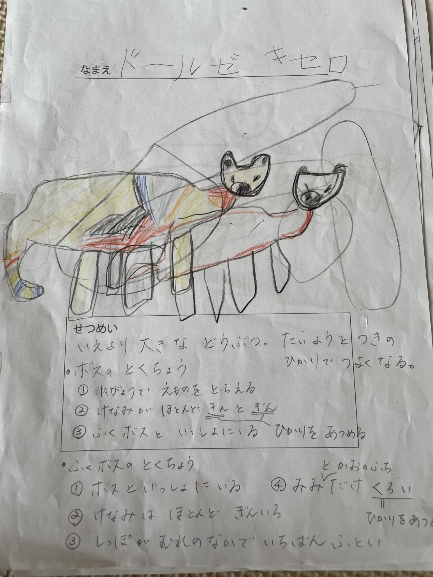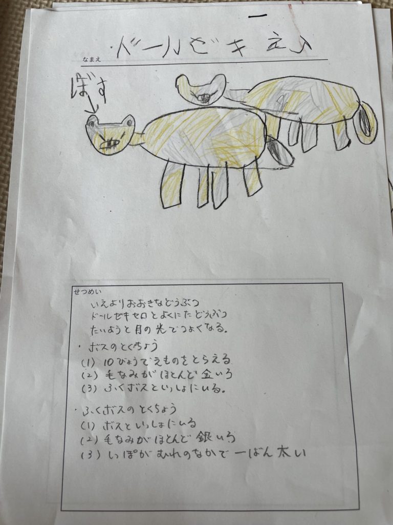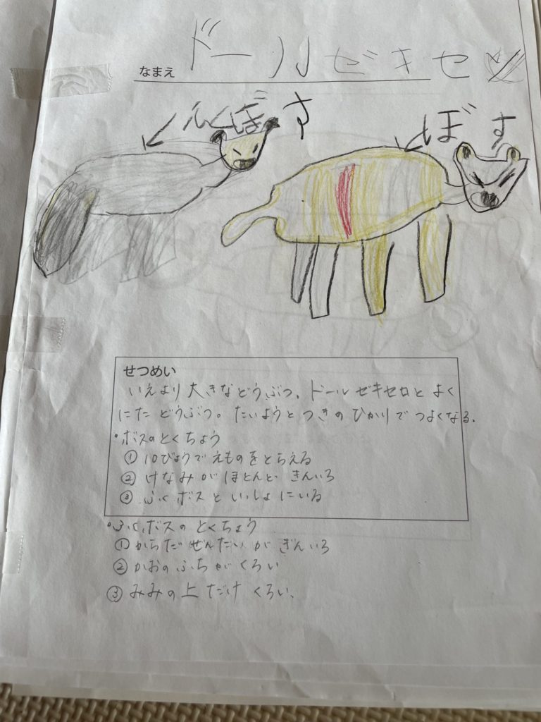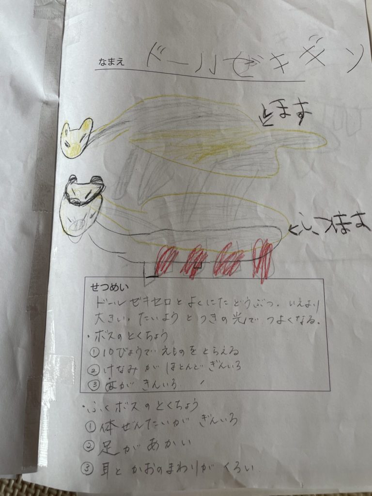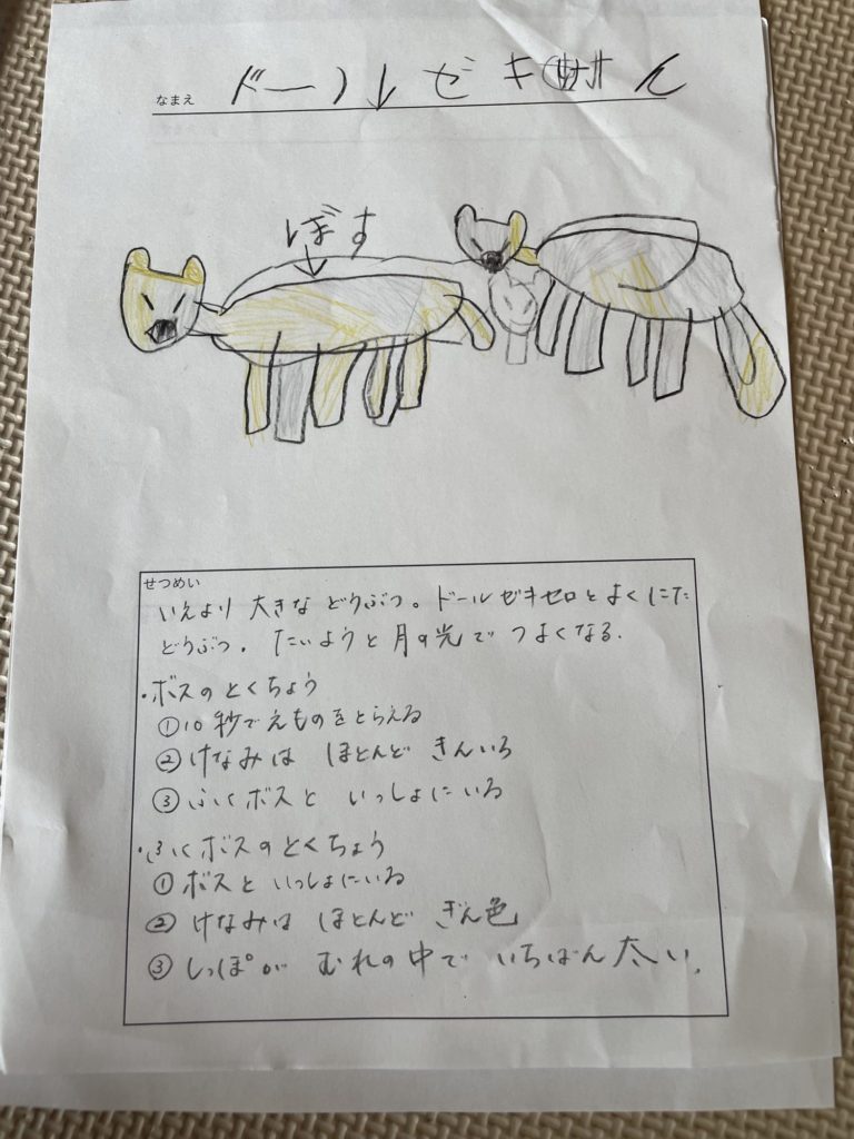 先生に倣って質問してみると、「ドールゼキセロ」の世界がどんどん広がって、その熱中ぶりが面白かったです!説明の部分は聞き取って、親が書きました。教室後も翌日も、さらに「ドールゼキセロ」と似た生き物を微妙に名前や特徴を変化させてアウトプットしていました。説明の部分は、うまく大人をつかまえて、「しゃべるから書いて!」とご執心の姿が素敵でした😀