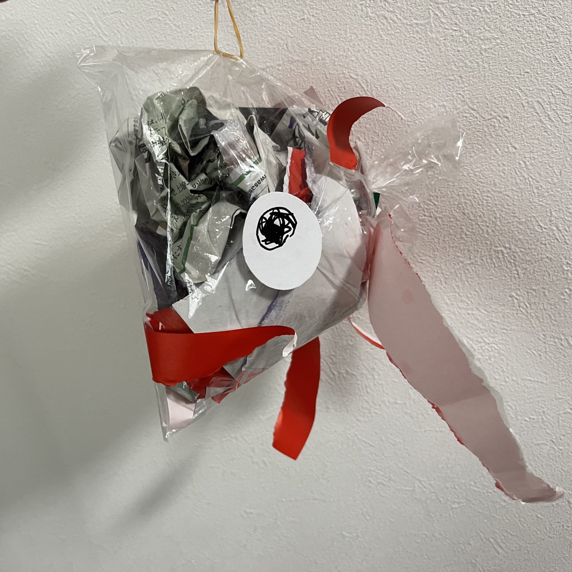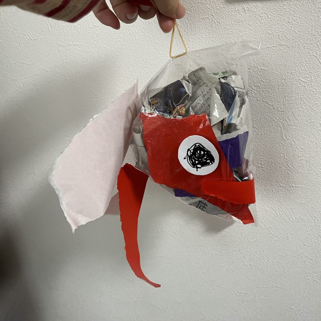 ちぎった紙を入れては出し入れては出し…なかなか太らないお魚でしたが、元気に泳いでいるマグロくんができました!