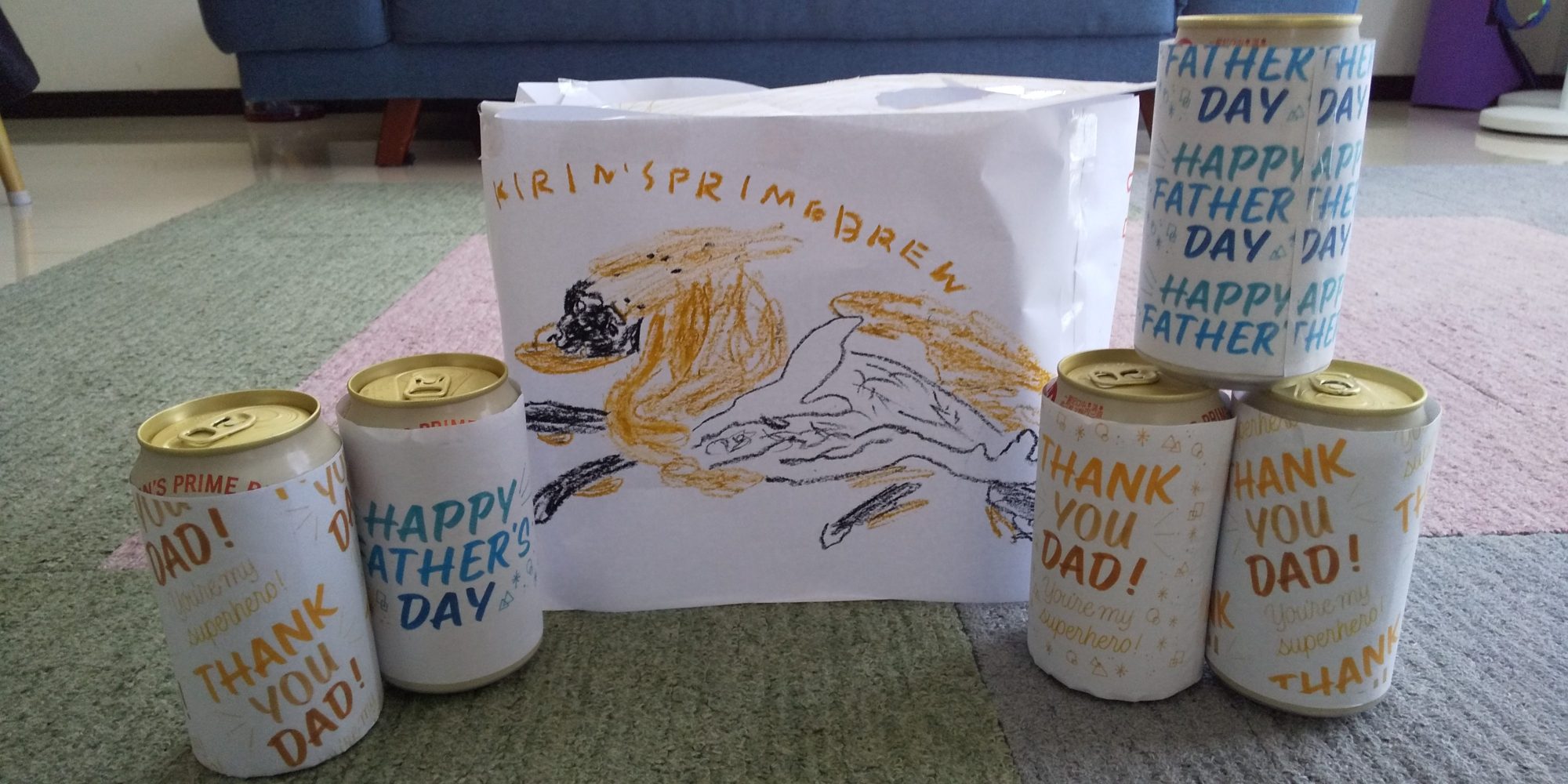 お父さんの好きな飲み物を作ったのかな? 缶に一本ずつありがとうって言葉が入っていたり、パッケージに迫力のあるきりんさんが描いてあって、頑張って作ったことが伝わってくるよ!
