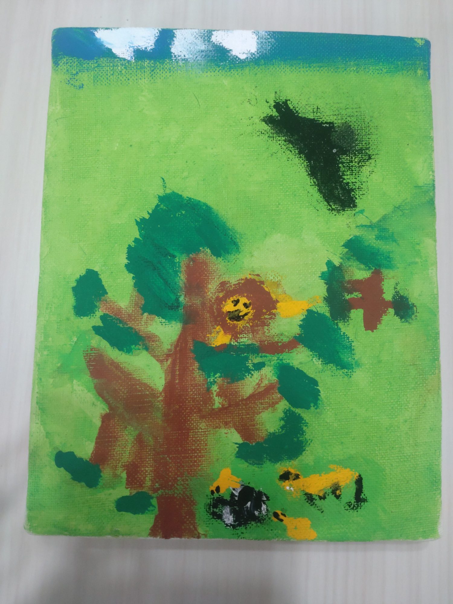 二週目までの作品は、緑の下地に、手前の木と、木の上のライオンしか描いてなくて、それはそれで緑の余白があるのも悪くなかったのですが、今回のレッスンで、絵を描き足して、さらに良くなったと思います。