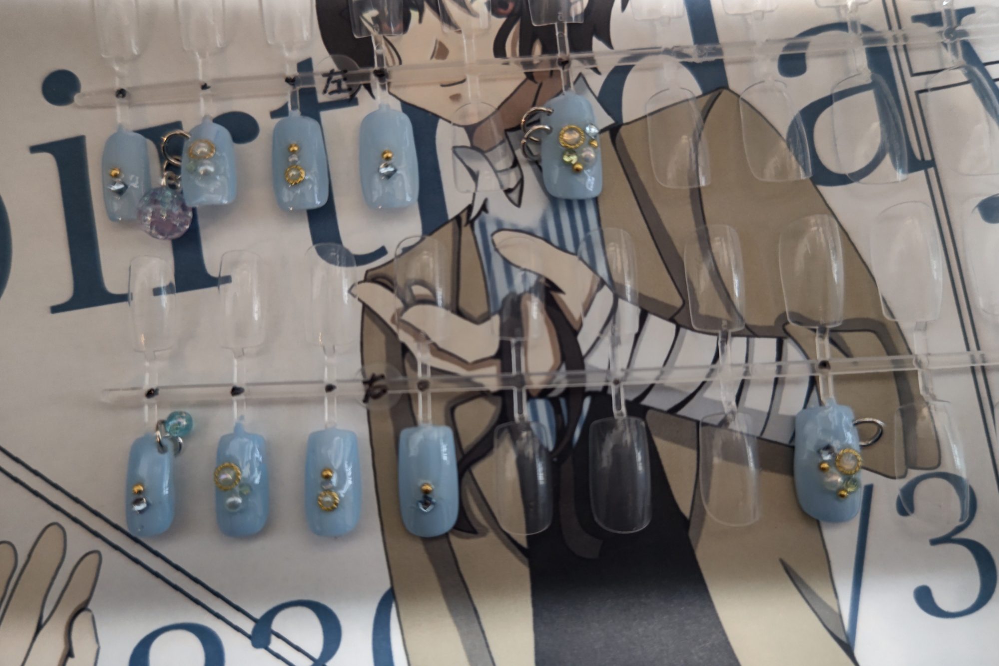 このネイルはキャラクターのイメージで作ったのかな? 淡い水色の綺麗なネイルが視界に入ると、気分も上がりそう!