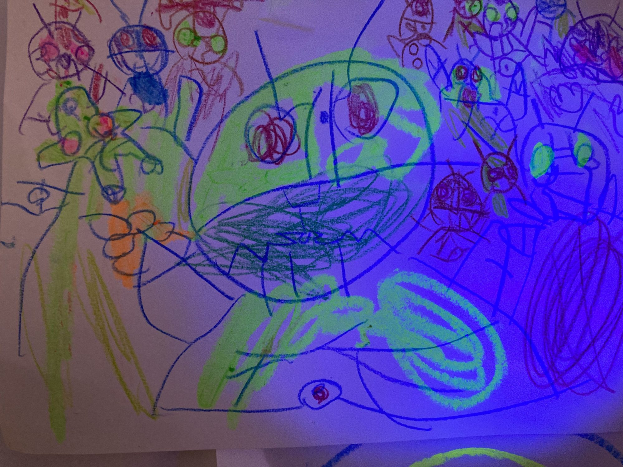 蛍光クレヨンを使ったお絵描きは初めてだったので新鮮でした。暗闇でライトを当てて光った時の驚きが楽しかったです❗️