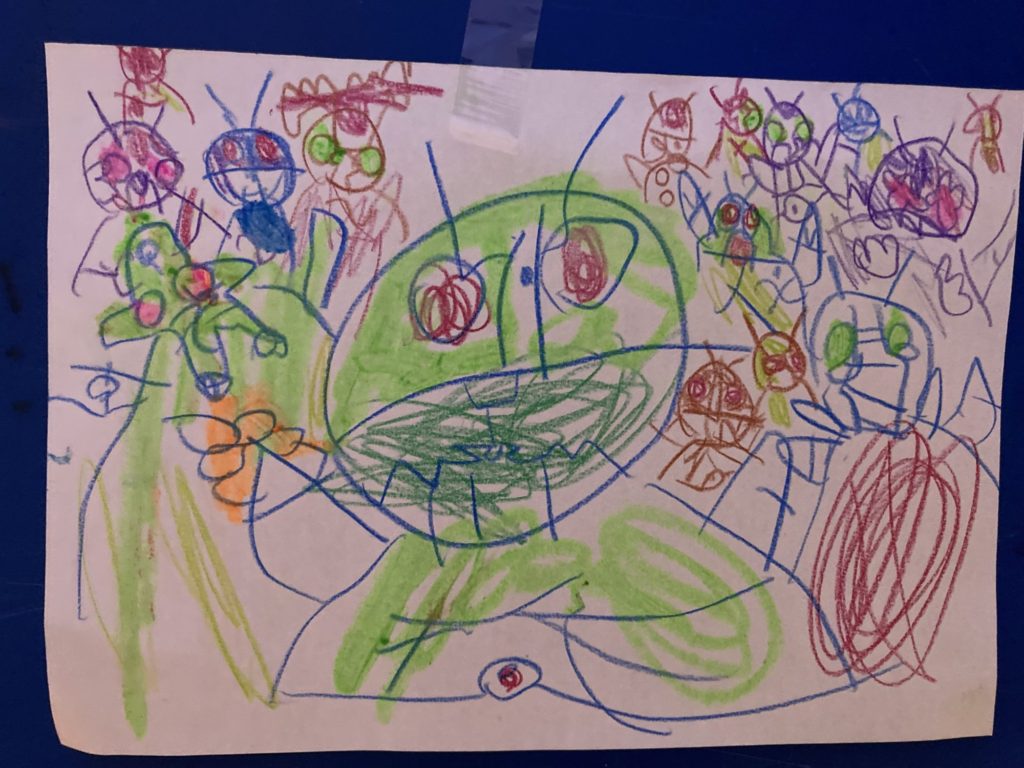 クレヨンの線、タッチの勢いが本当に魅力的です!躍動感あふれる絵になってます!