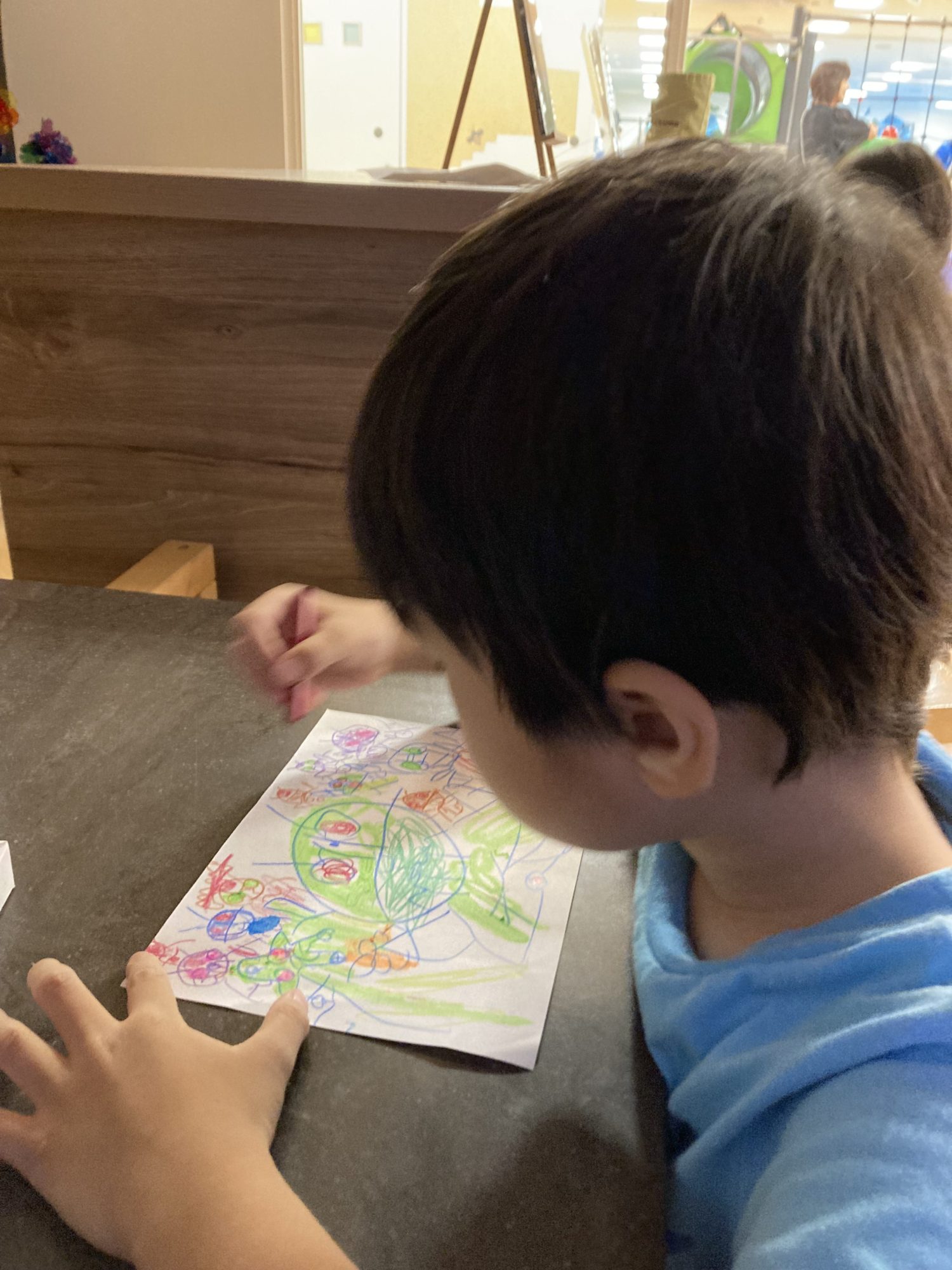 暑くて公園に行くのも危険なので室内の遊び場に行ったら「暗闇アート」のお部屋がありお絵描きしたり万華鏡を作ってみたりと普段できない楽しい経験ができました。