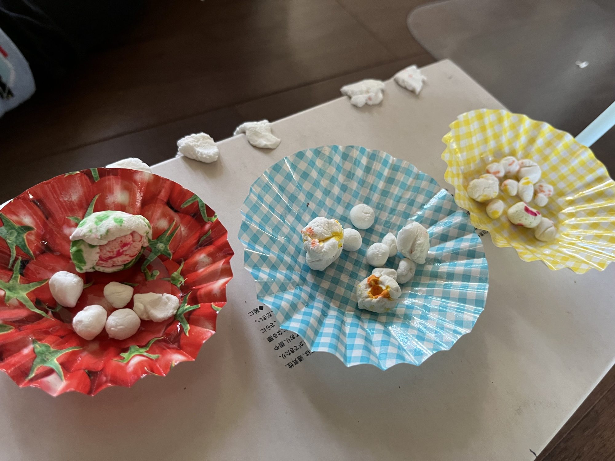 フルーツが入っていたり、お顔が描いてあったりするケーキと飴のお店です。お店側にはストックがあり、オーダーで模様を描いてくれます。