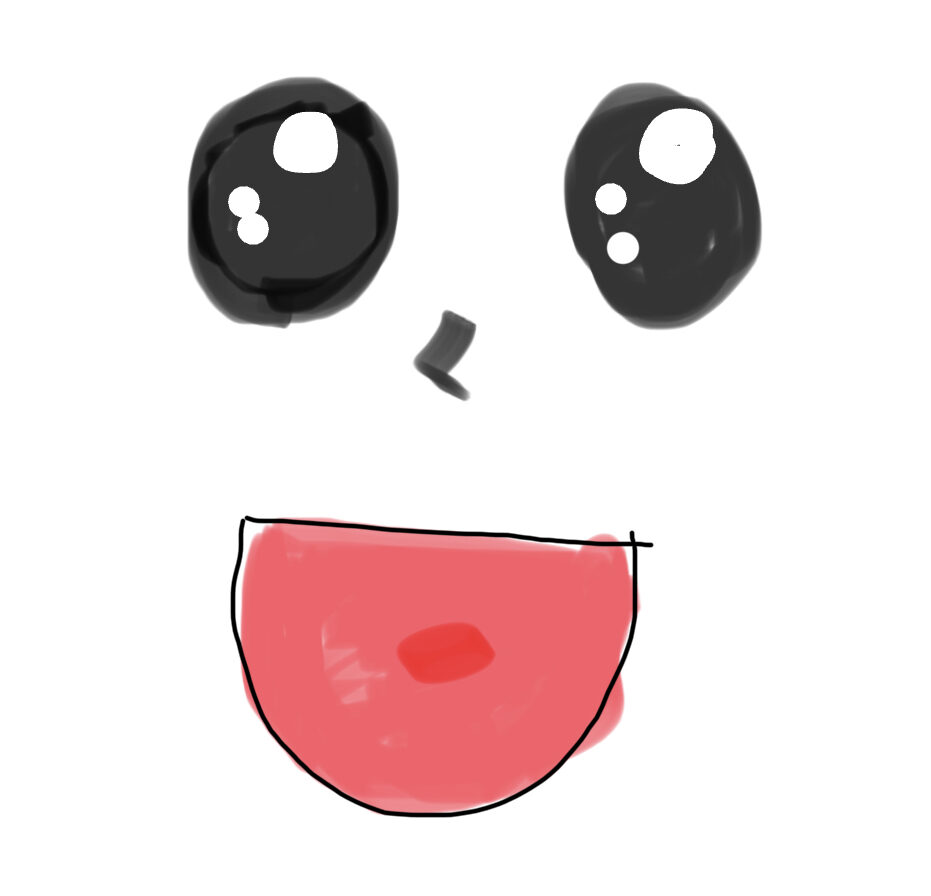 だったら、たとえば目のまわりを少しだけ囲むようにして黒を塗るだけでも少し目が大きくなるし、口は添付画像のようにしたら赤を入れられそうかな?