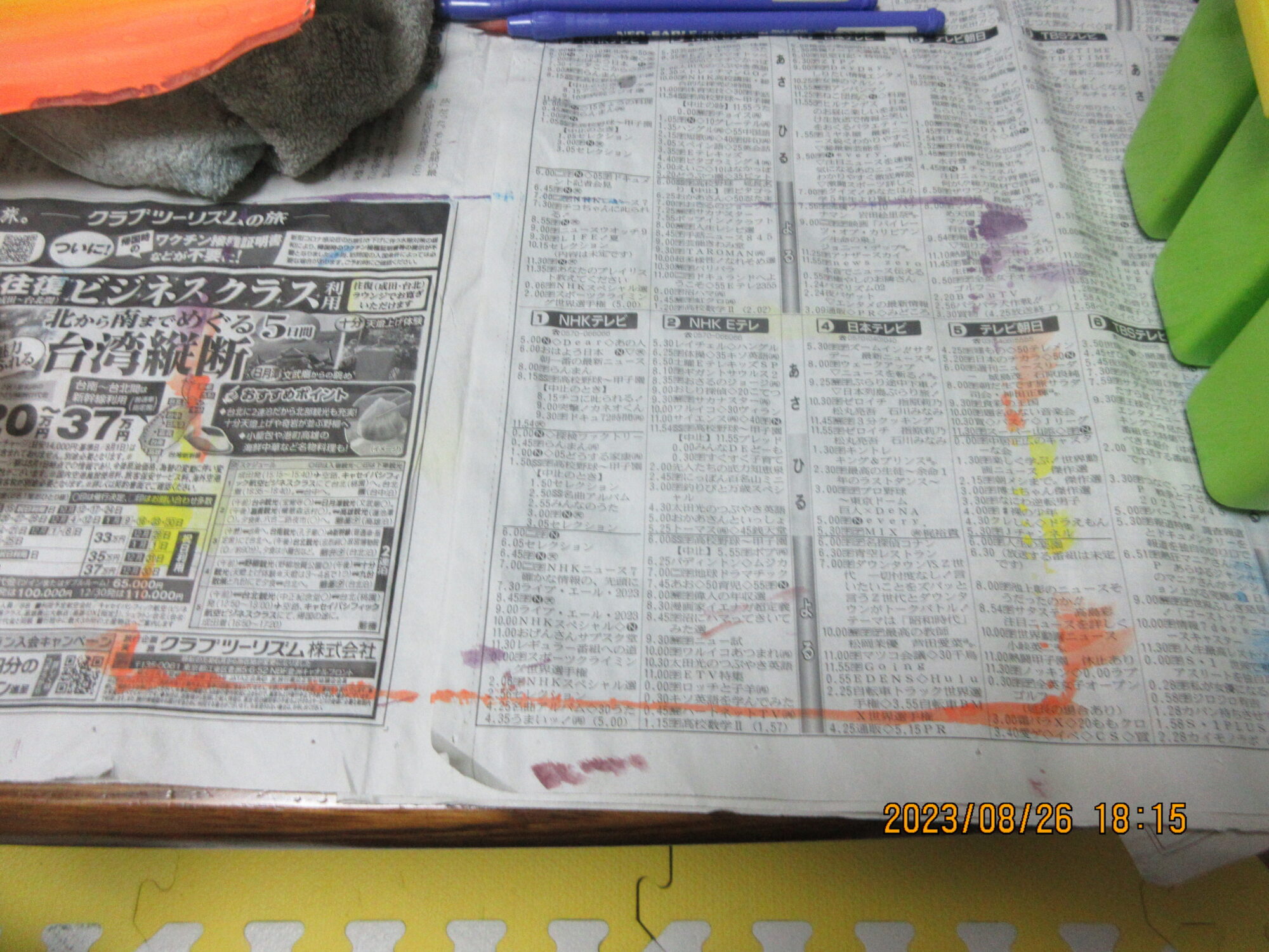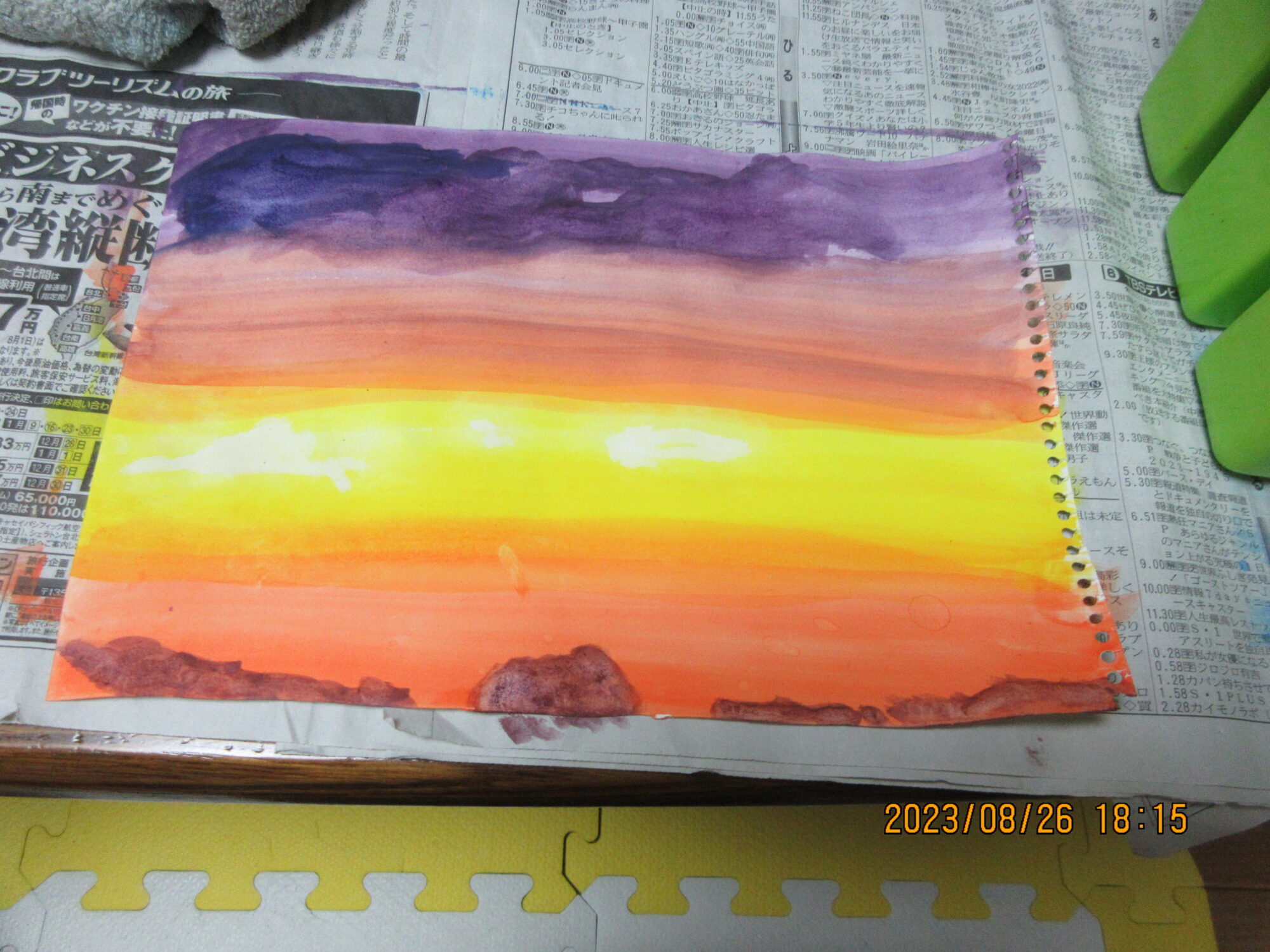 夕焼け空を書きました。新聞紙めっちゃ汚れたけど、まあいいか!