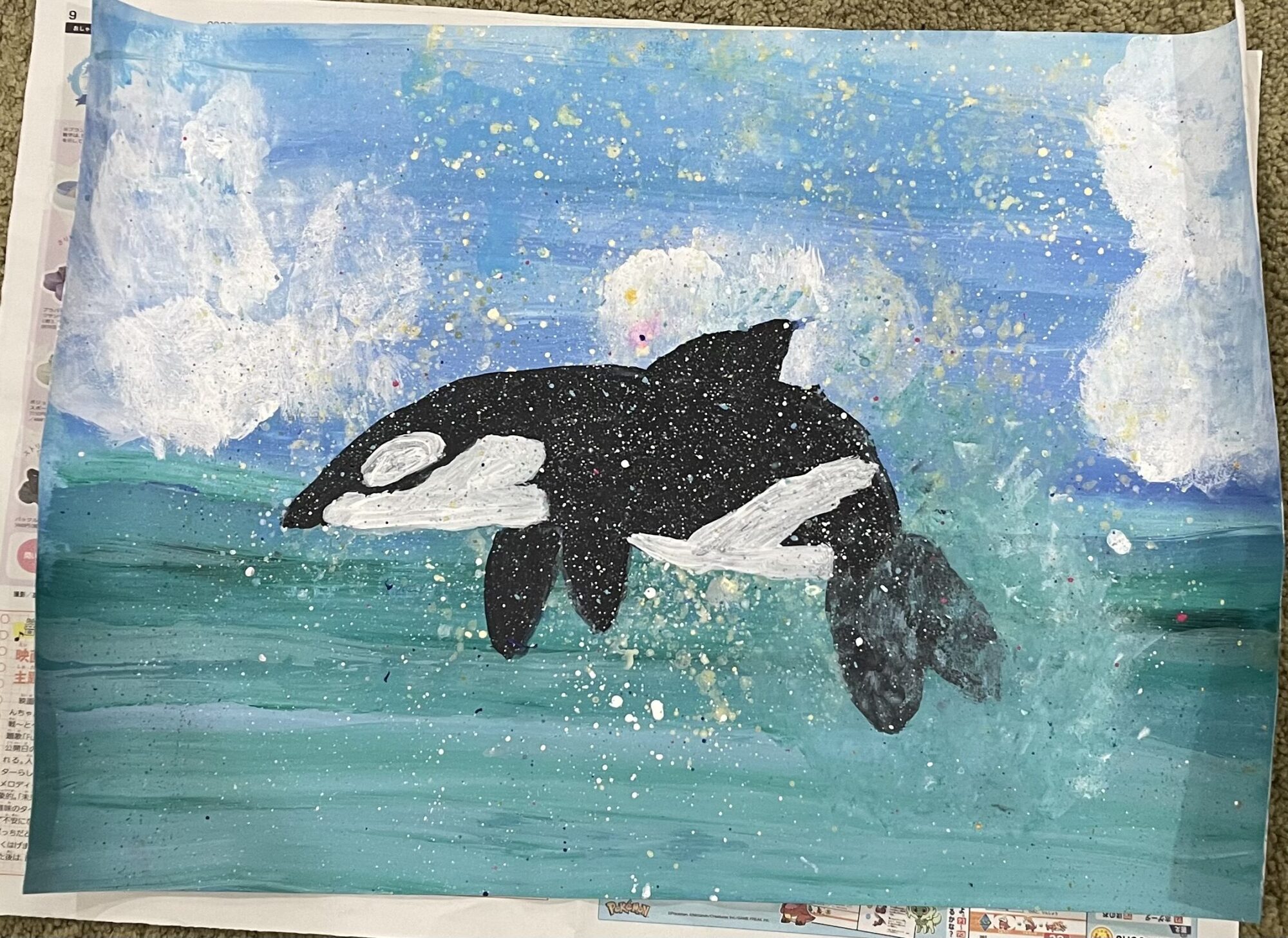 水しぶきを飛ばすのをがんばりました。スポンジで雲をかくのが楽しかったです。