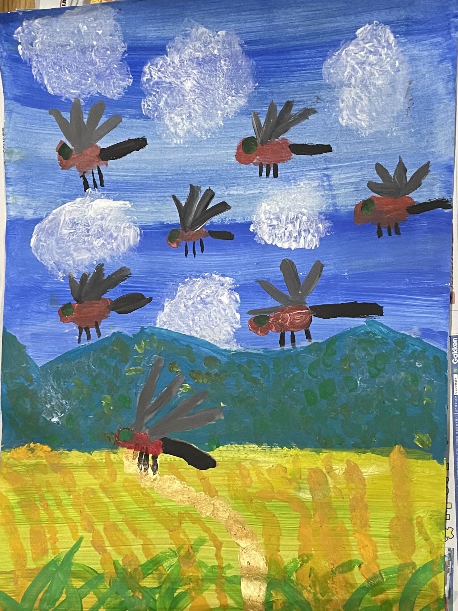 トンボをたくさんかきました。いなほのツブツブを表現するのが難しかったです。