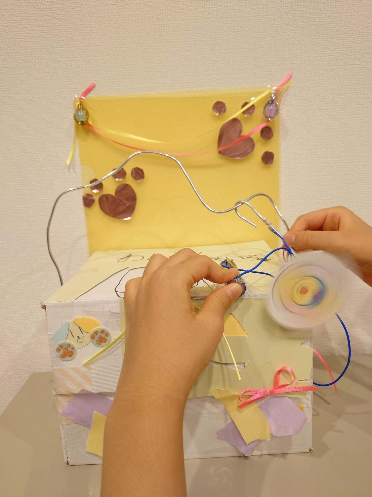 クリアファイルの壁の上の方に、モールと家にあったビーズを使って、ランタンのような飾りを作りました。