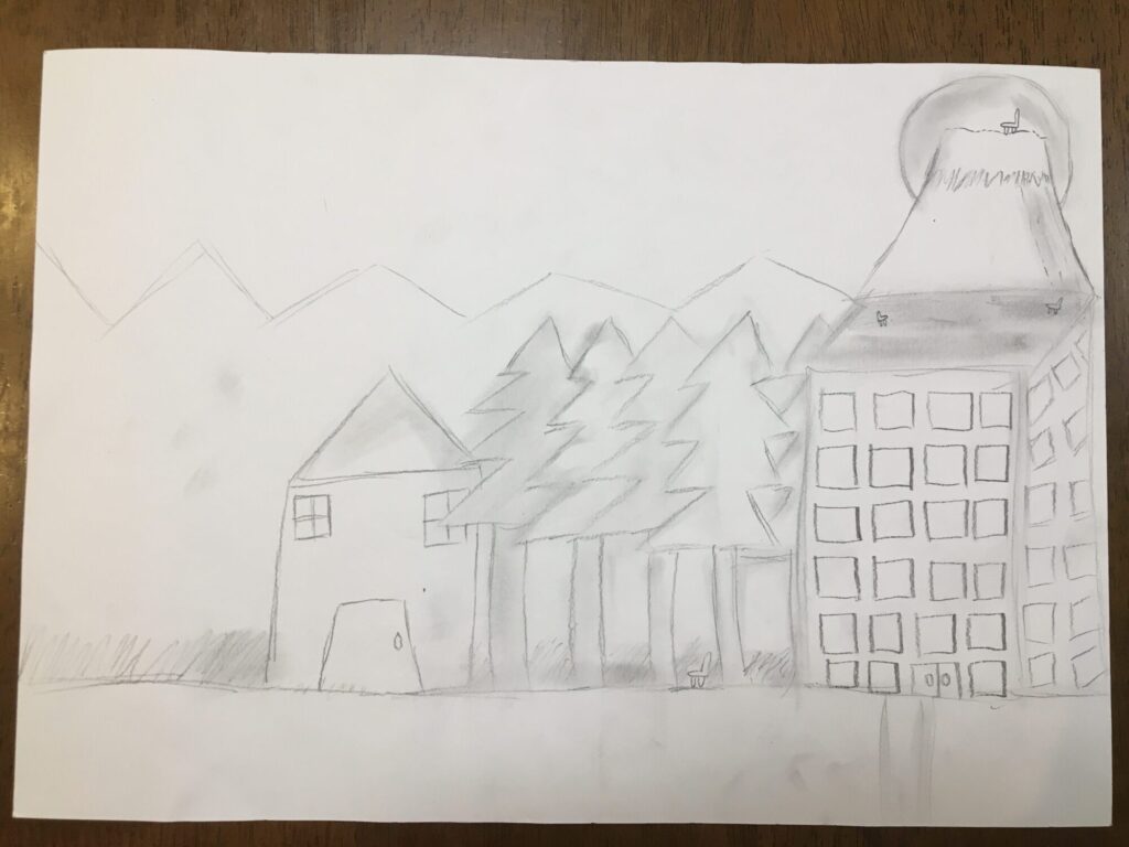 下書きで、富士山、夕陽、建物、山、木々を描きました。2回目のレッスンで色を塗るのがとっても楽しみです。
