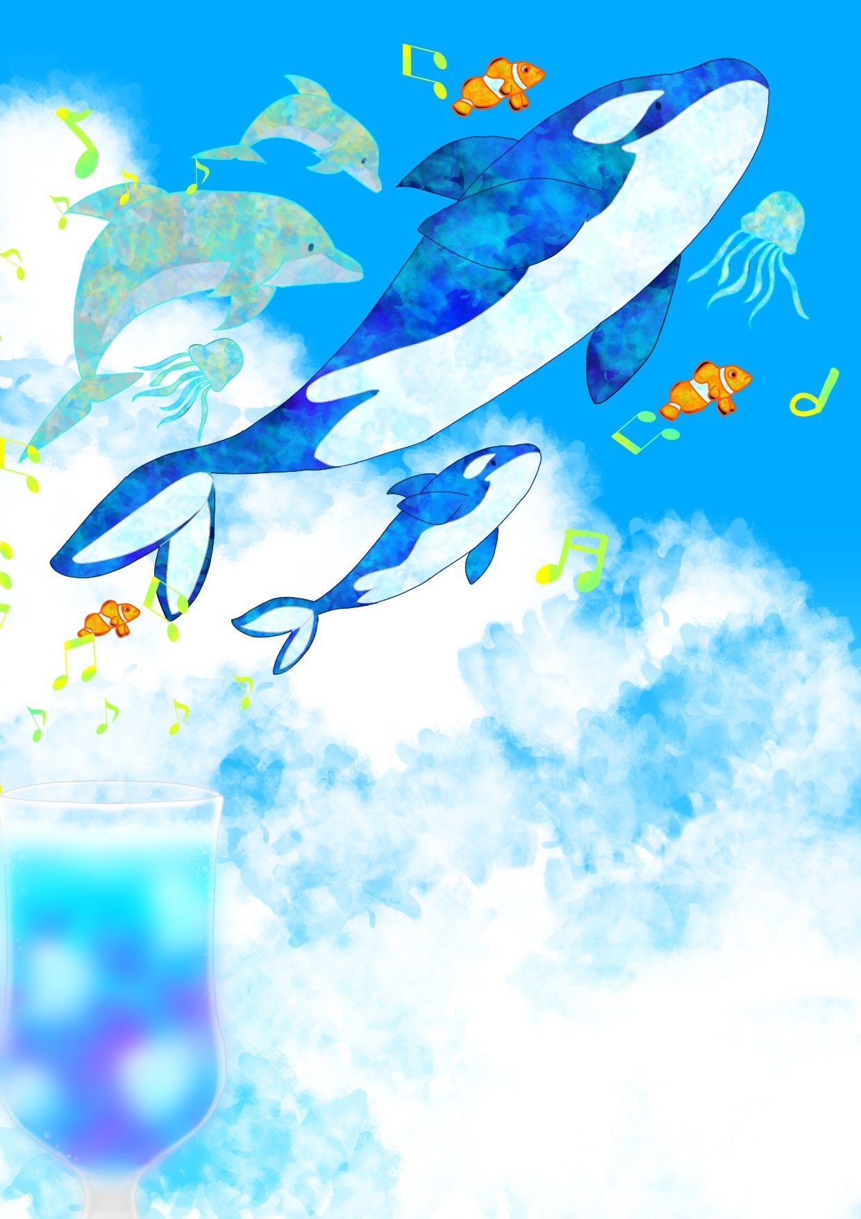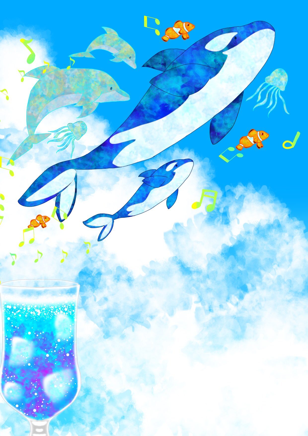 夏空を悠々と泳ぐ海の生き物や入道雲の色の塗り方が、