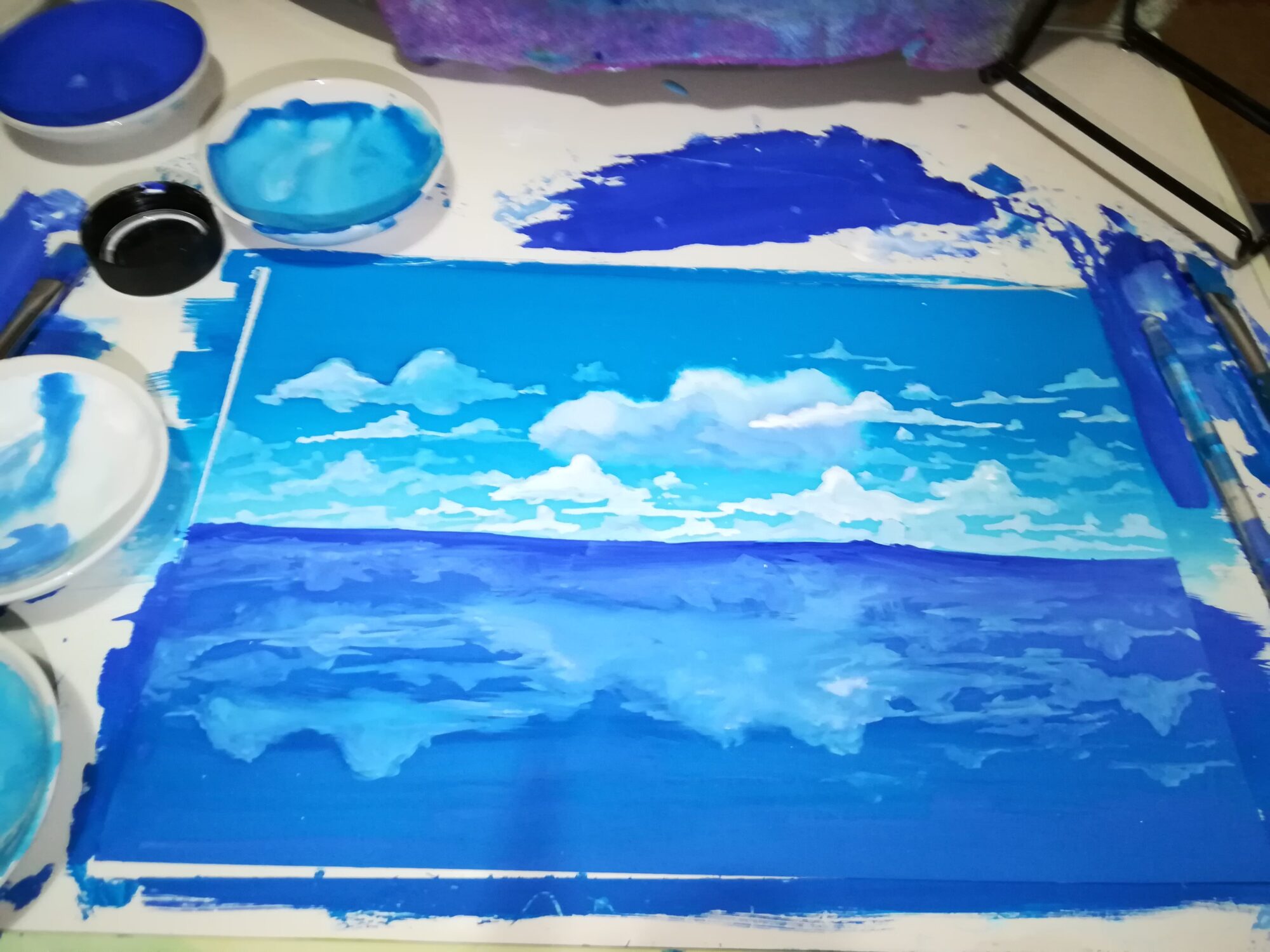 空の雲はすごくきれいに描けているから、あとは、海に写り込む雲の描き方だよね。。