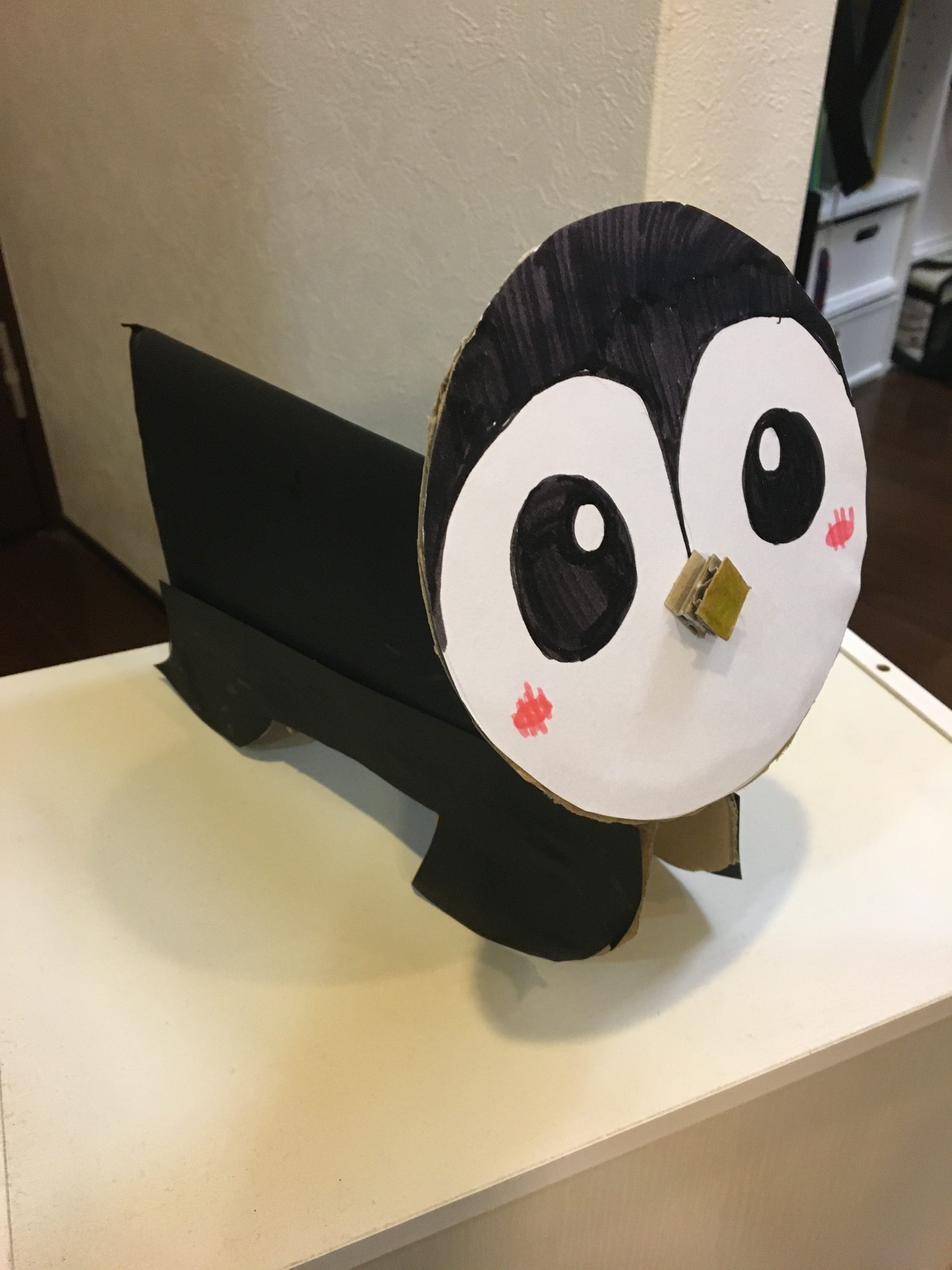 ダンボールアートで氷の上を滑るペンギンを作りました。