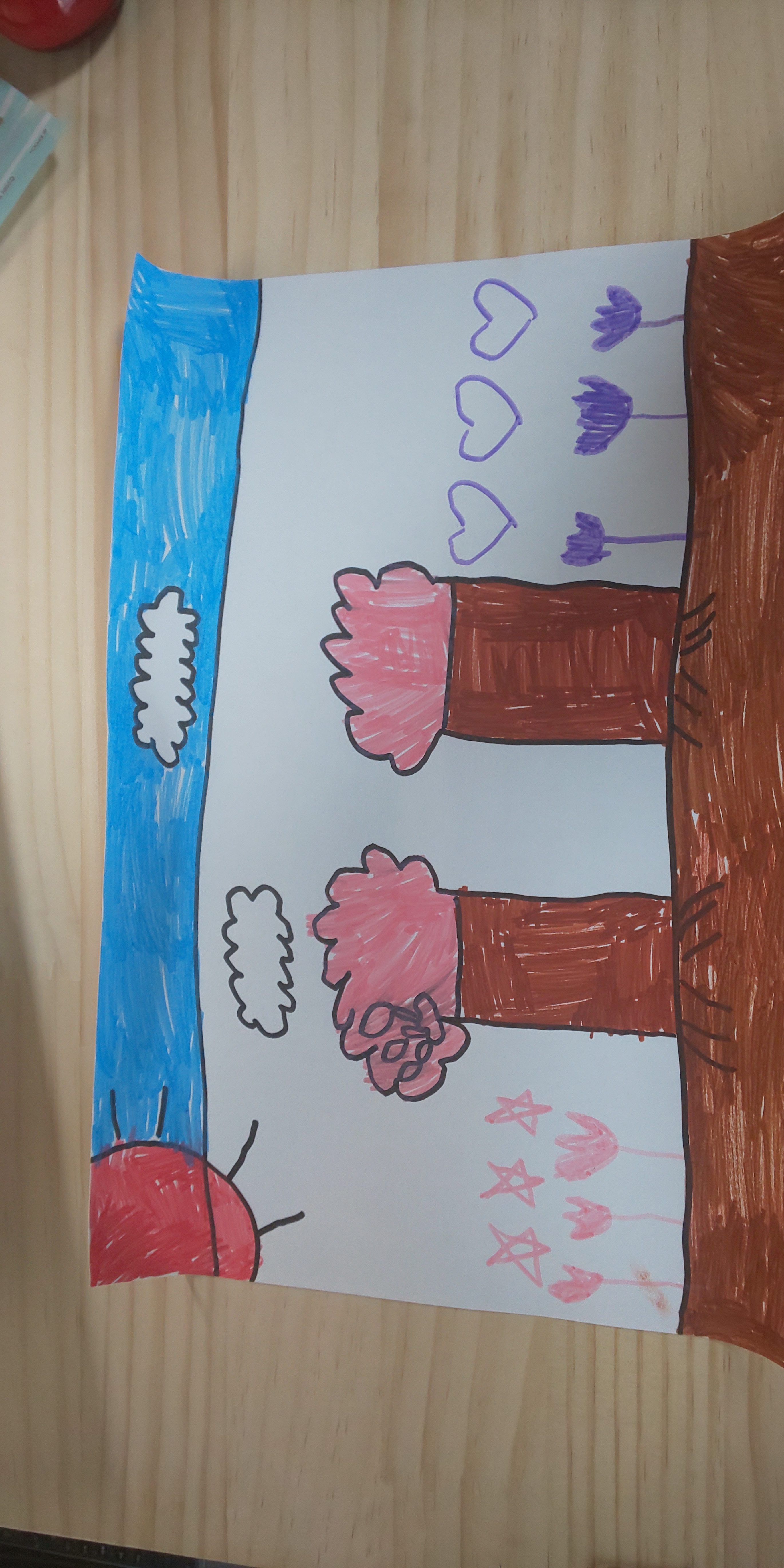 カラーペンでお空や土、木、花まで綺麗に塗りましたね。