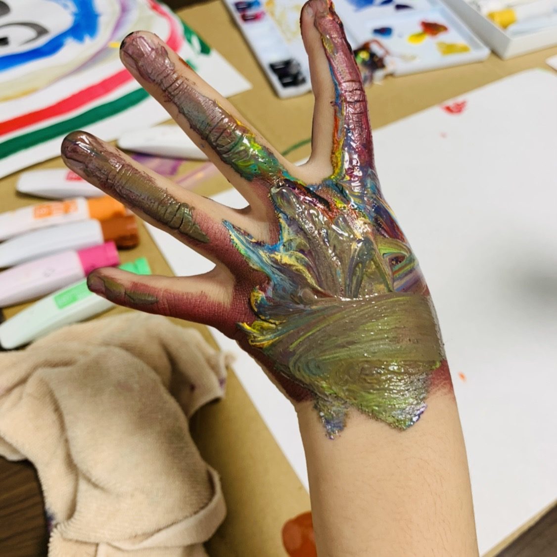 特に・・今子供たちは外に出て発散できない日が続いているので、手に絵具を塗りつけて発散するなどは心の安定におすすめです。