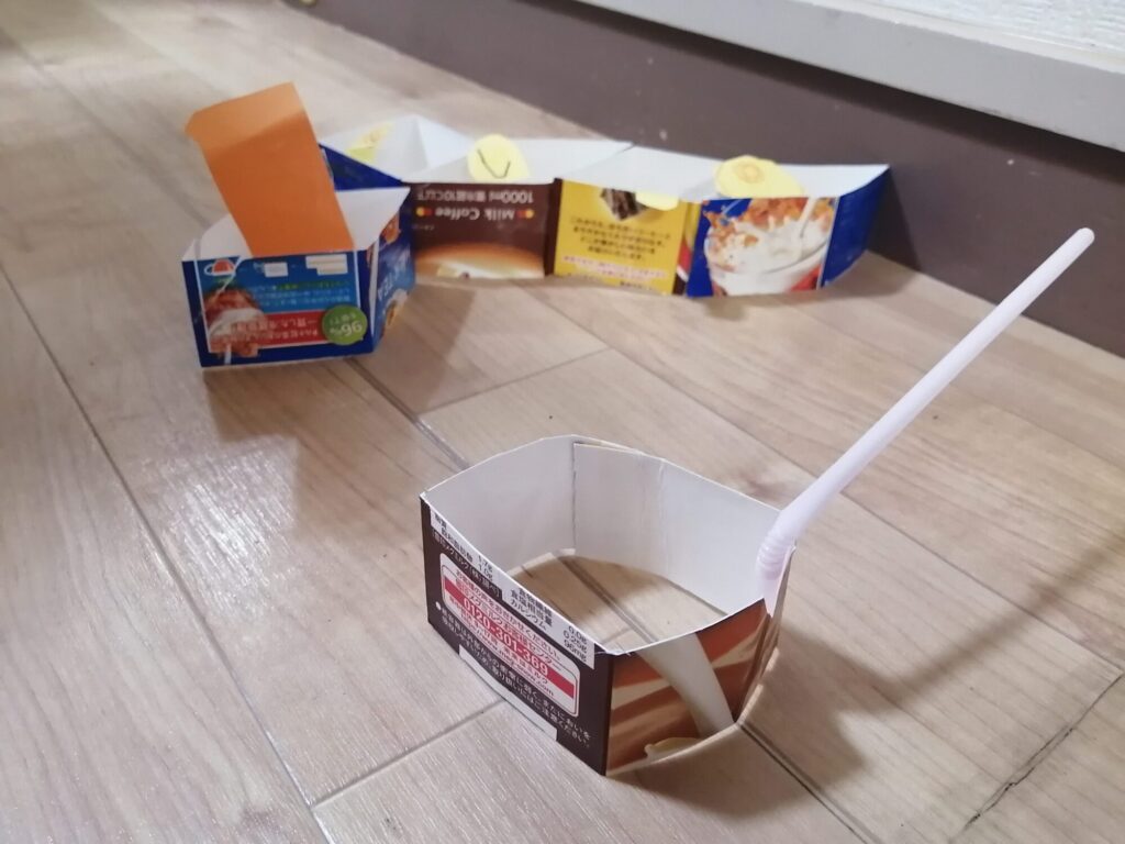 紙パックの素材を上手に使いこなしていますね!!たくさんの作品がそれぞれの個性を持っていて、いろいろ工夫している様子が浮かびます!ニョロニョロとした電車がとっても可愛いです!