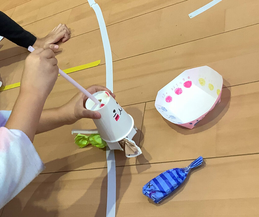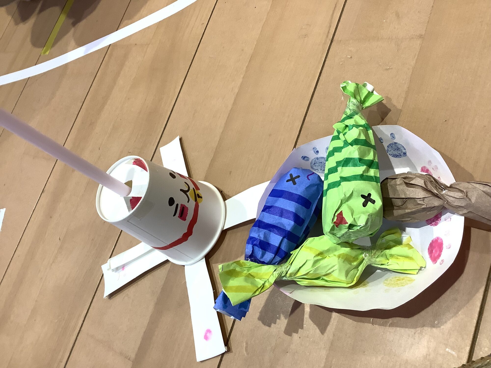 紙をねじって魚のおびれをつくっているのがとってもいいね!あめもつくっていておいしそう〜