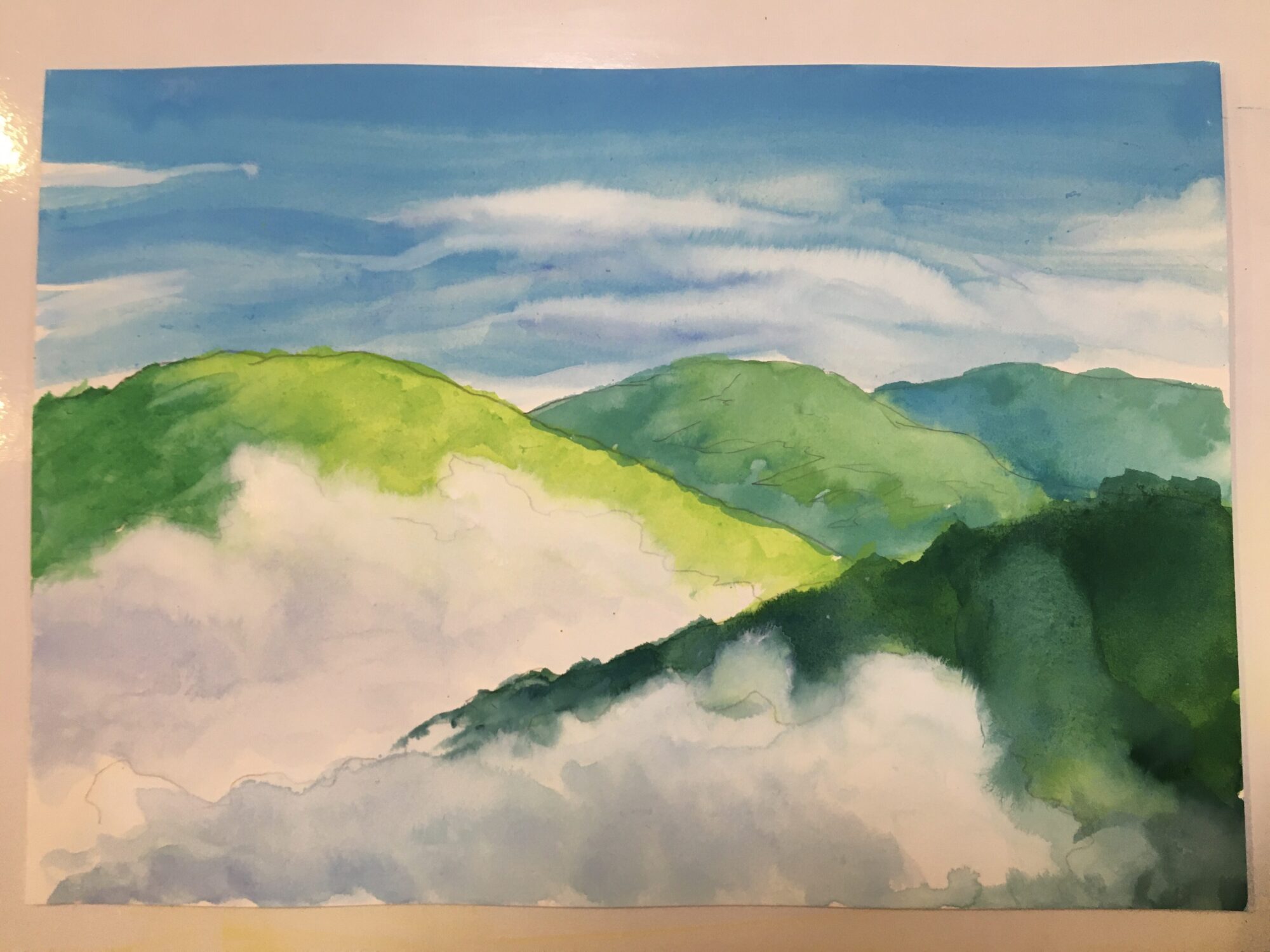 雲が、いつものような丸い感じではなく、細長く連なるような雲だったので、武重さんからのアドバイスや塗り方をよく見て塗り進めました。山は、木を植えていく感じを意識して、筆を細かく動かしながら塗り、柔らかい感じを出すことができました。