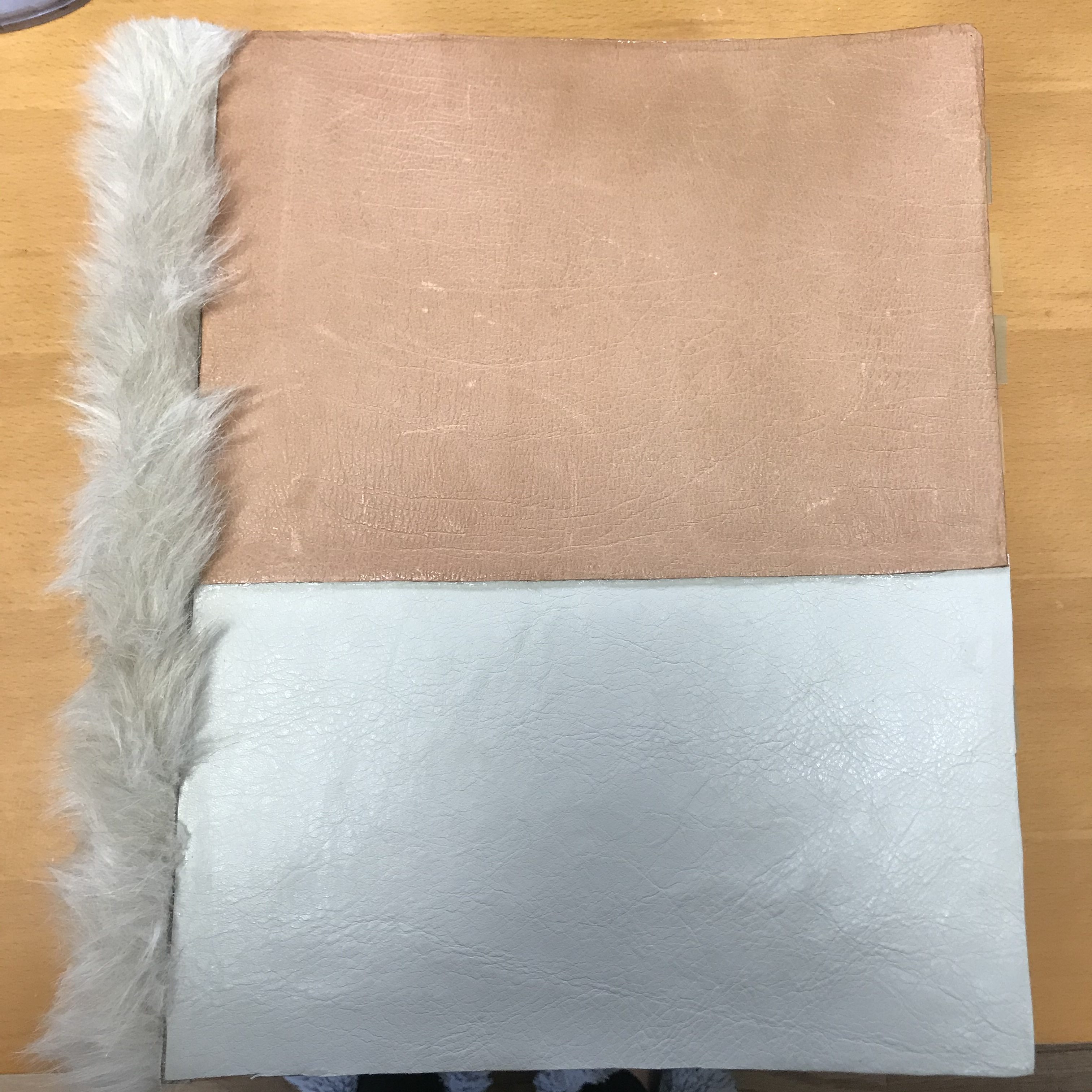 まゆ先生のお制作のお部屋の押入れに眠っていた 昔買った革の端切れと、フェイクファーでつくりました。