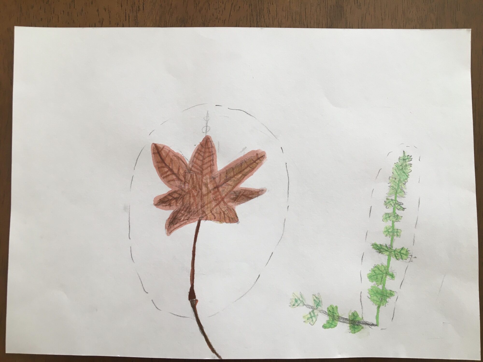 紅葉の葉脈をよく観察して描いたのがとても伝わってきました!たくさん見だことによって想像では描きずらいような複雑な部分まで描けていてすごい!絵の具と色鉛筆をどちらも使う方法も見つけたんだね!素晴らしいです!