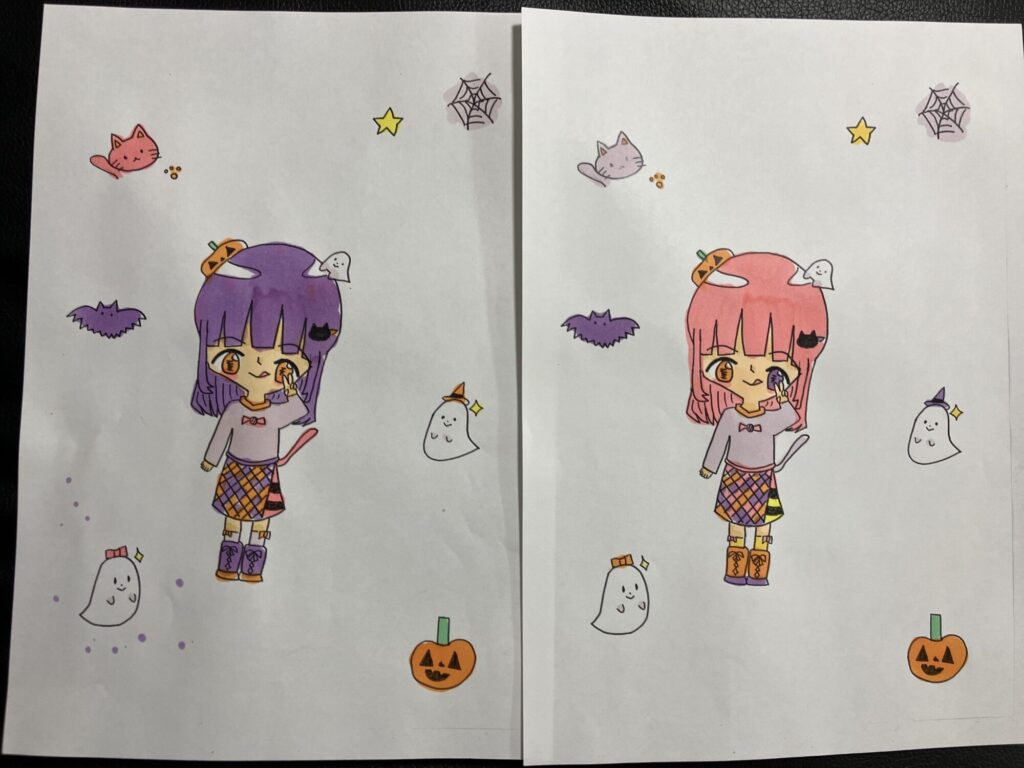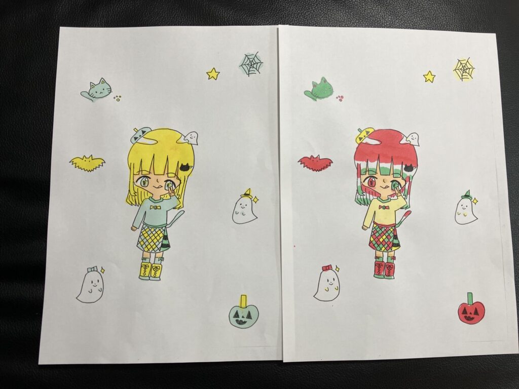 黒いペンで絵を描き、コピーして、色んなパターンの色を塗ってみました。