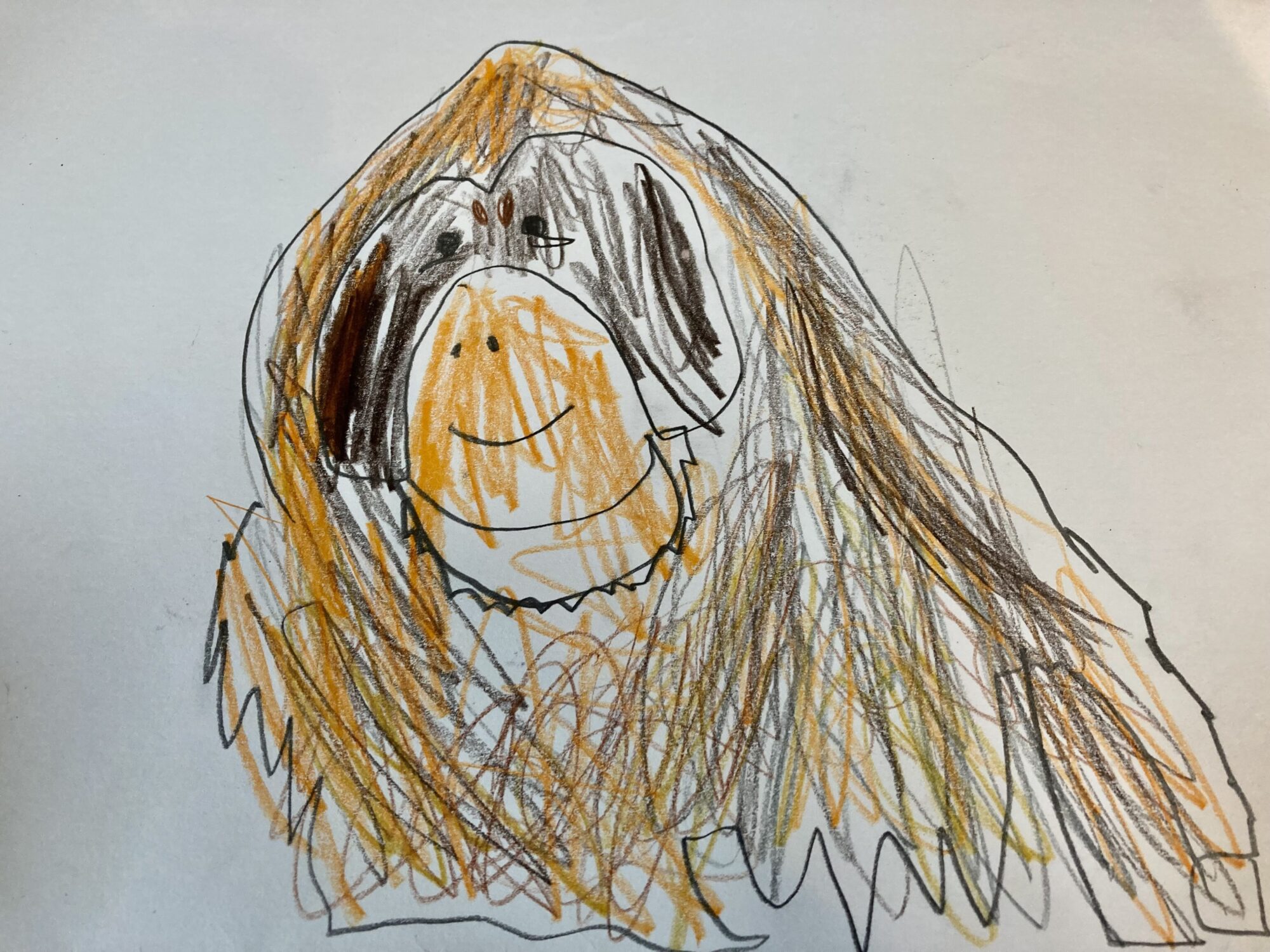 実際に動いている、本物のオランウータンをスケッチしたんだなと、絵からリアルタイムの動きがしっかり伝わってきます!やくどうかんがあって良いですね👏