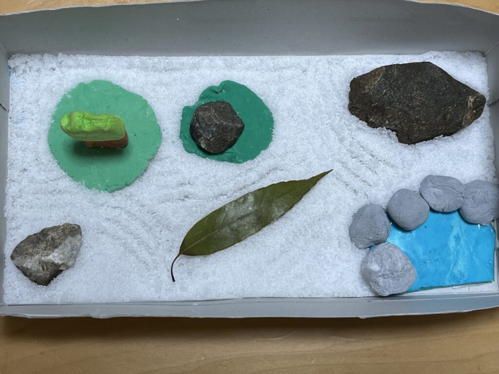 粘土でこけ、木、池をつくりました。池はセロファンも重ねてきれいな色にしました。