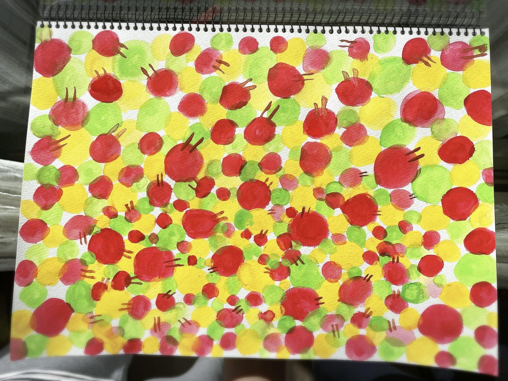 とても鑑賞していて楽しい気持ちになる作品だね!色の組み合わせ方もリズミカルで綺麗です。丸い形を小さくしてみたり、大きくしてみたりこだわりも感じられるよ!