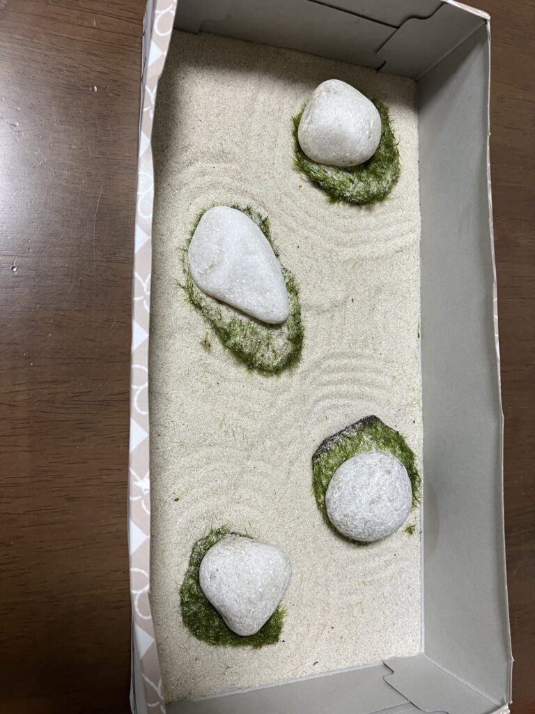 シンプルな庭にして、箱の外側に石垣の絵を描きました。砂で模様を描くのが楽しかったです。