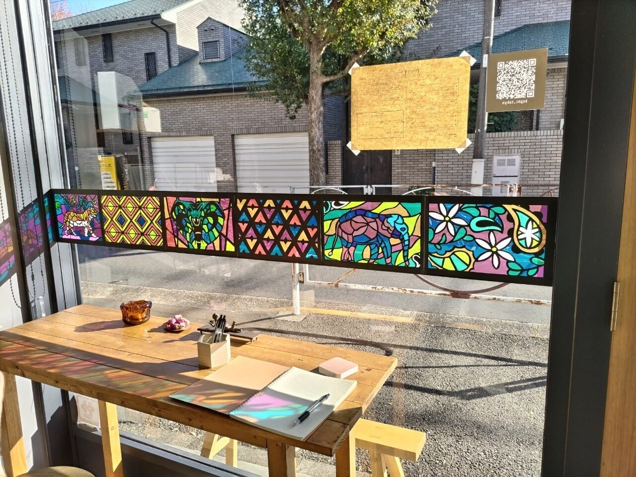 展示しているのは、黒い紙とセロファンを材料にしたステンドグラス風作品。