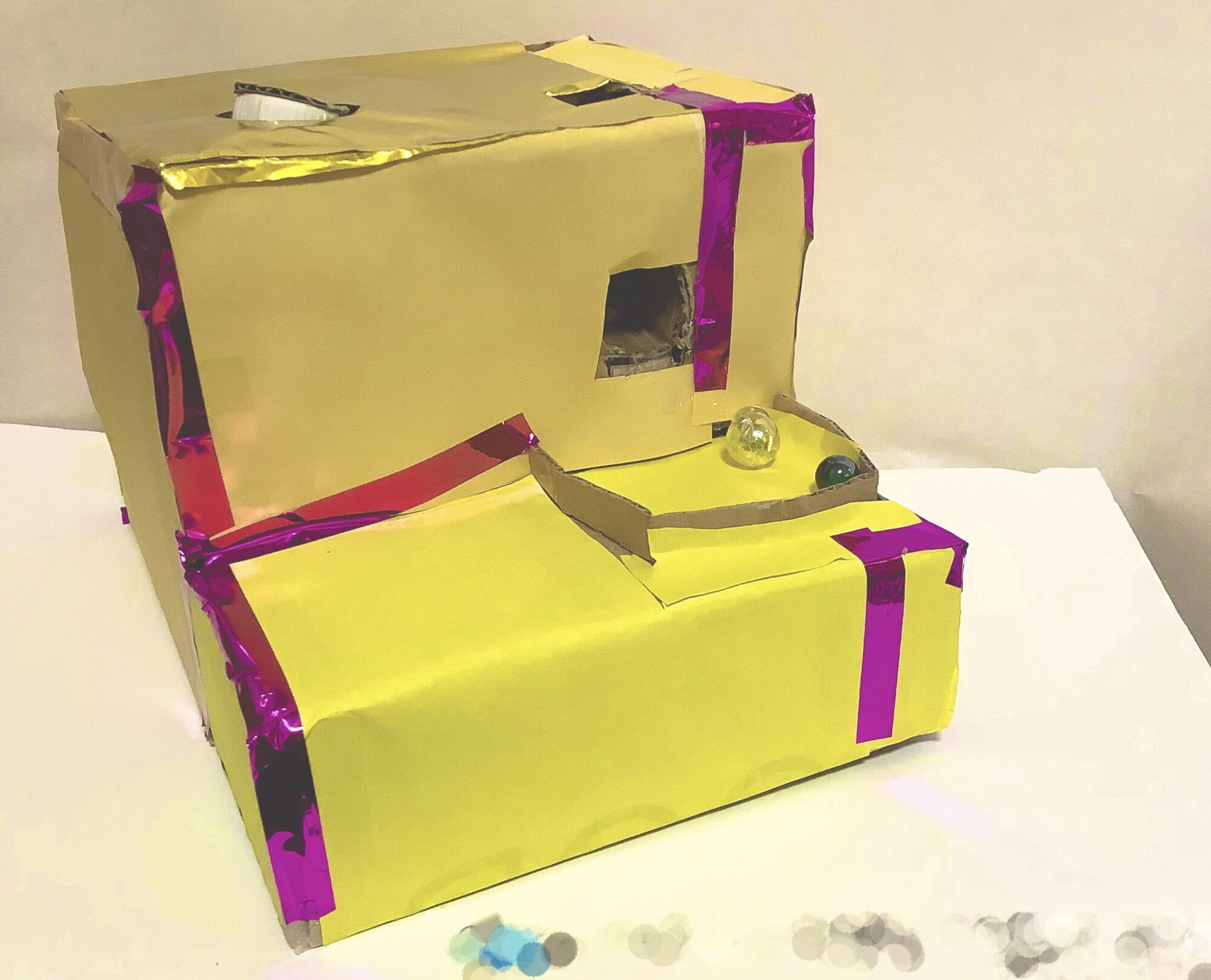 中も段ボールでビー玉を入れたら、出口でとまって、ボタンを押すと、出口を塞いでいる段ボールが下って、ビー玉が出てきます