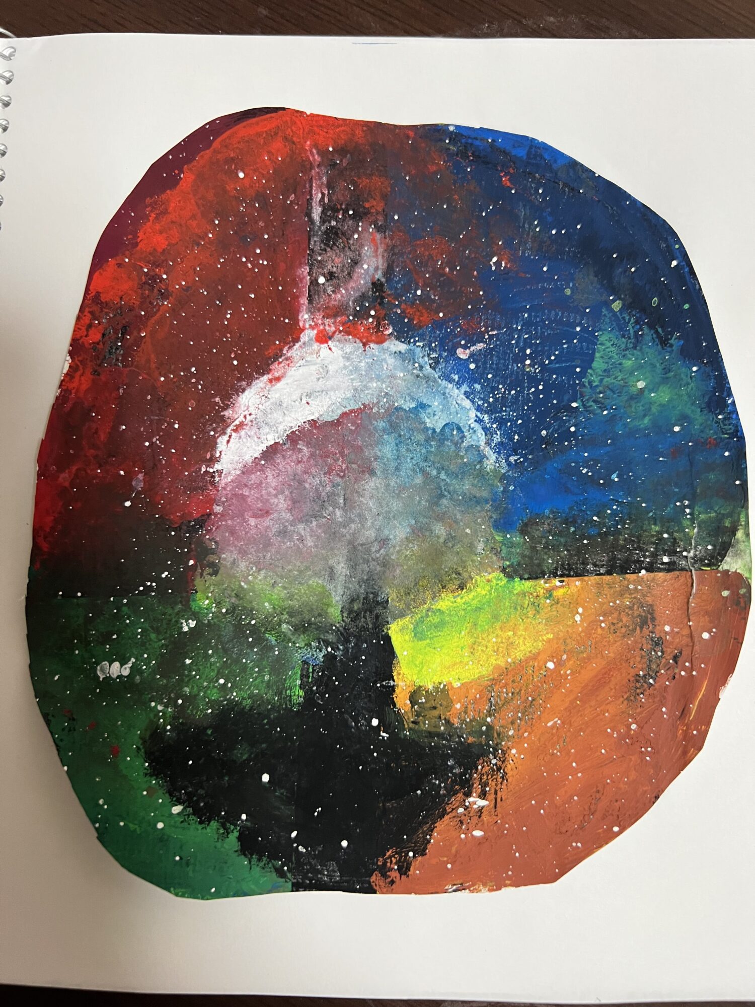 色の混ざり方がとても幻想的ですね、散りばめられた白い絵の具もキラキラしてみえます✨️絵の中で色々な筆の使い方がされていて素晴らしい作品だと思いました!