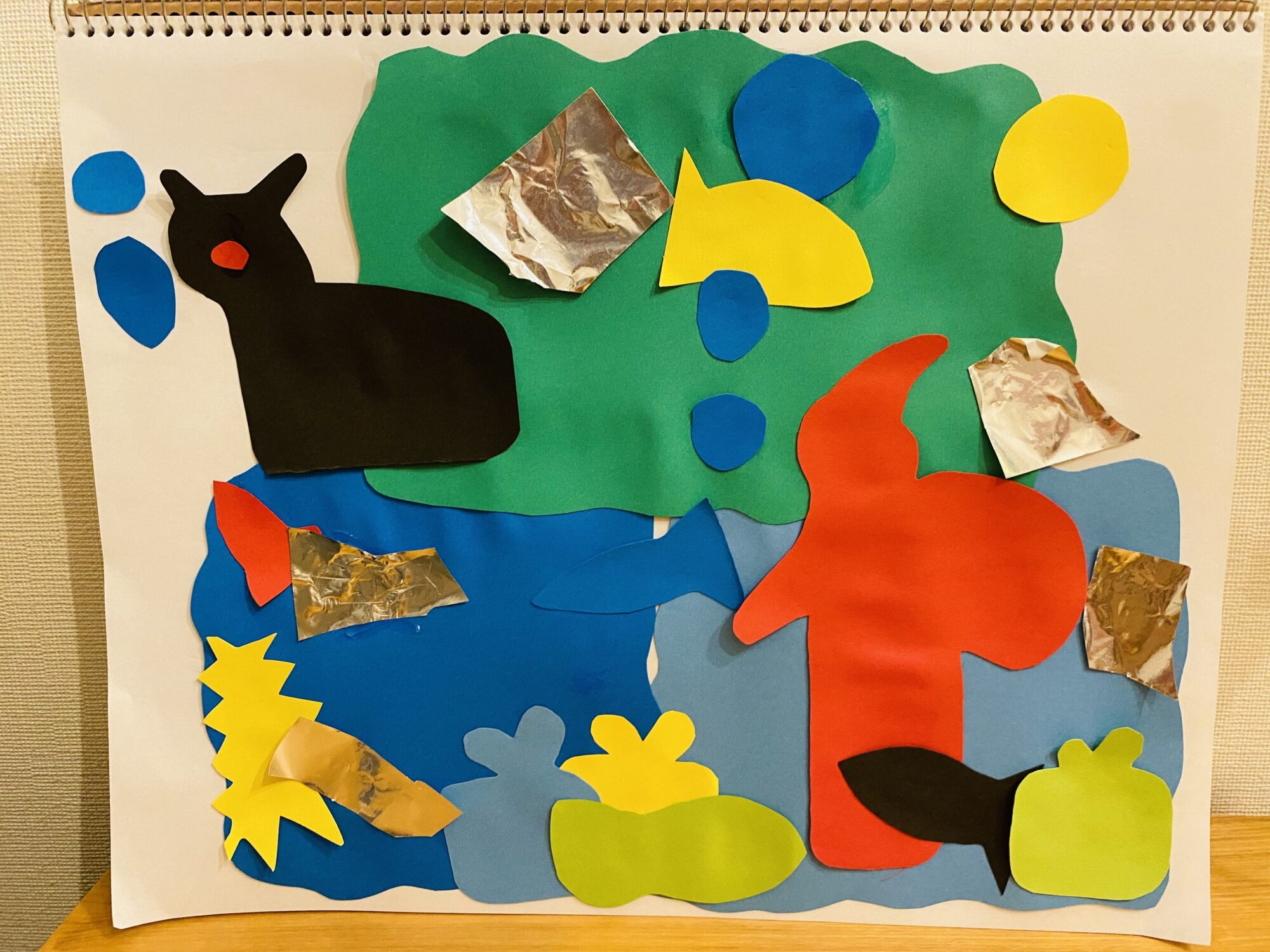 サンタさんの形から始まって最終的に海のイメージに変わる柔軟な発想力がすごいです!今までに見た事のない組み合わせで驚くと同時に感動しました…✨️自由に切りとった形をバランスよく配置できているのも素晴らしいなと思いました!
