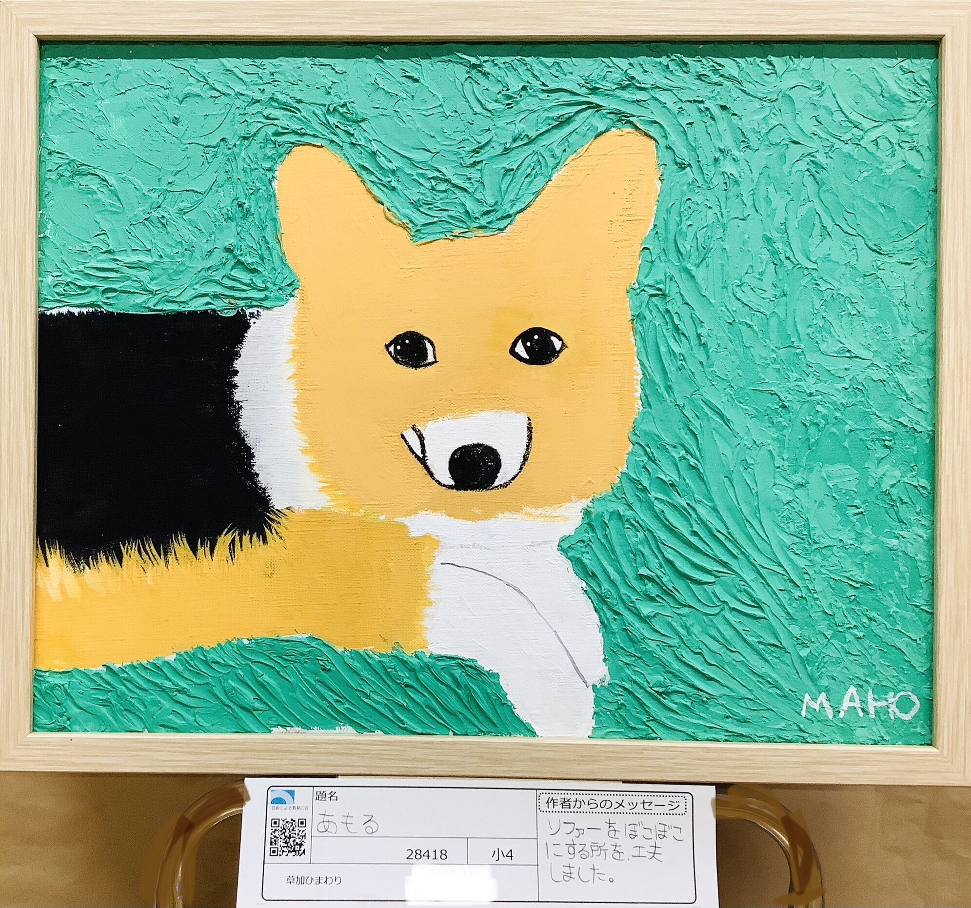 はるかせんせい 先生2024年1月9日 11:39 AM 絵の具を盛り上げてソファの質感を作っているのがおもしろいですね! 絵筆で細かく線をひいて犬の毛を表現しているところが上手ですごいな〜と思いました! お行儀よくしながら、力強い眼差しでじっとこちらを見つめているのがかわいいです!🥰 ログインして返信する ↓
